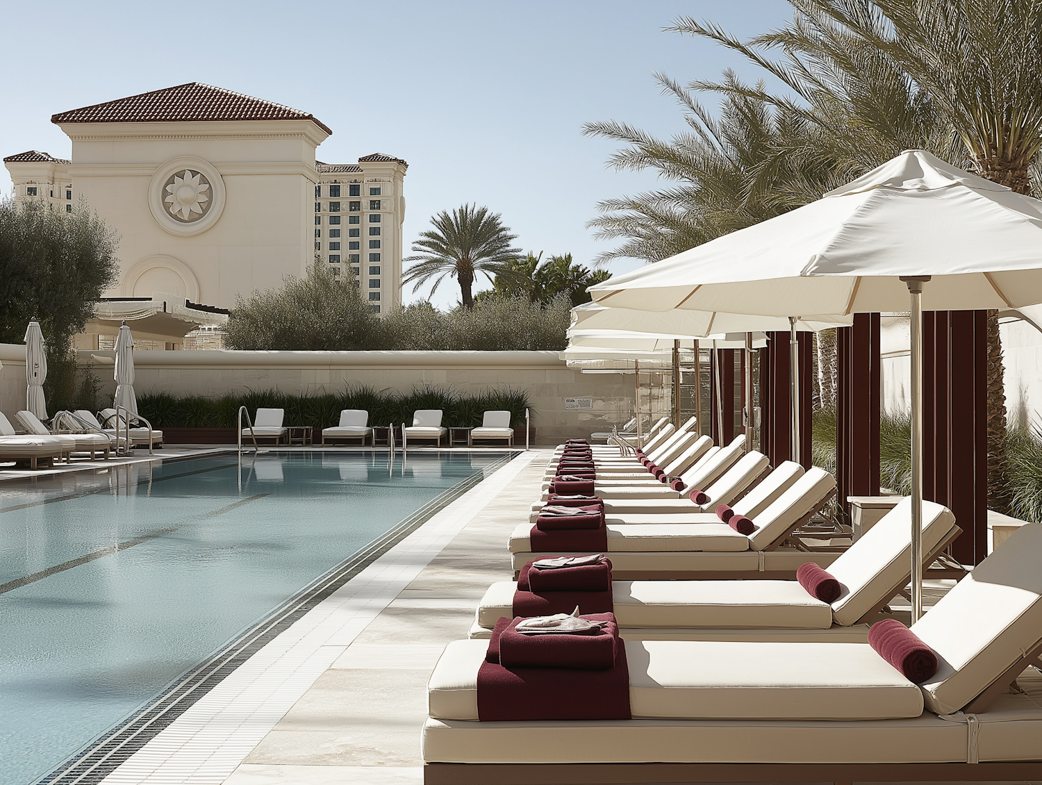 Luxurious poolside with beige loungers, burgundy towels, white umbrellas, and a serene backdrop of palm trees and elegant architecture.