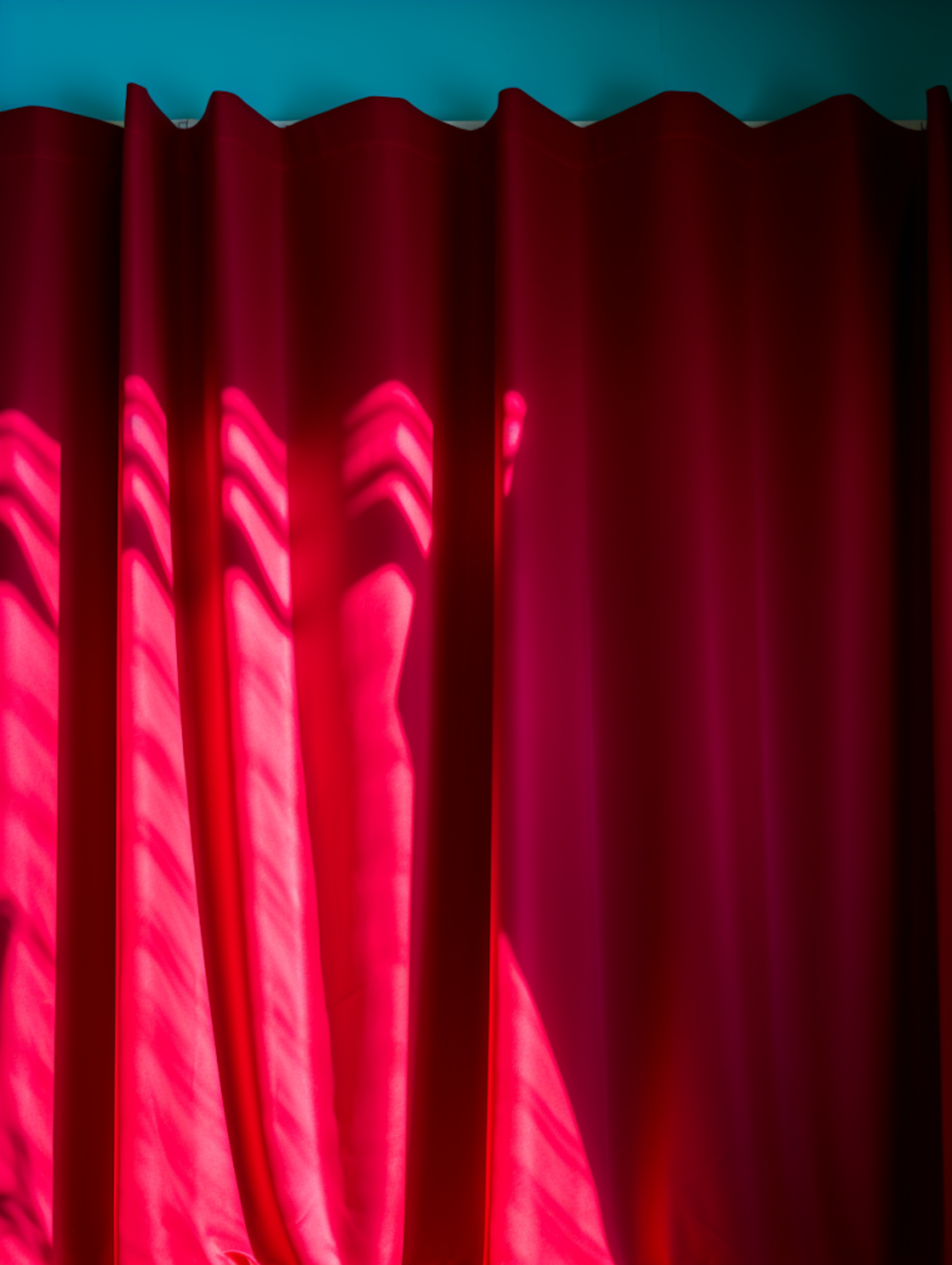 Vibrant red curtain with sunlight casting patterns, set against a teal wall, creating a striking visual contrast.