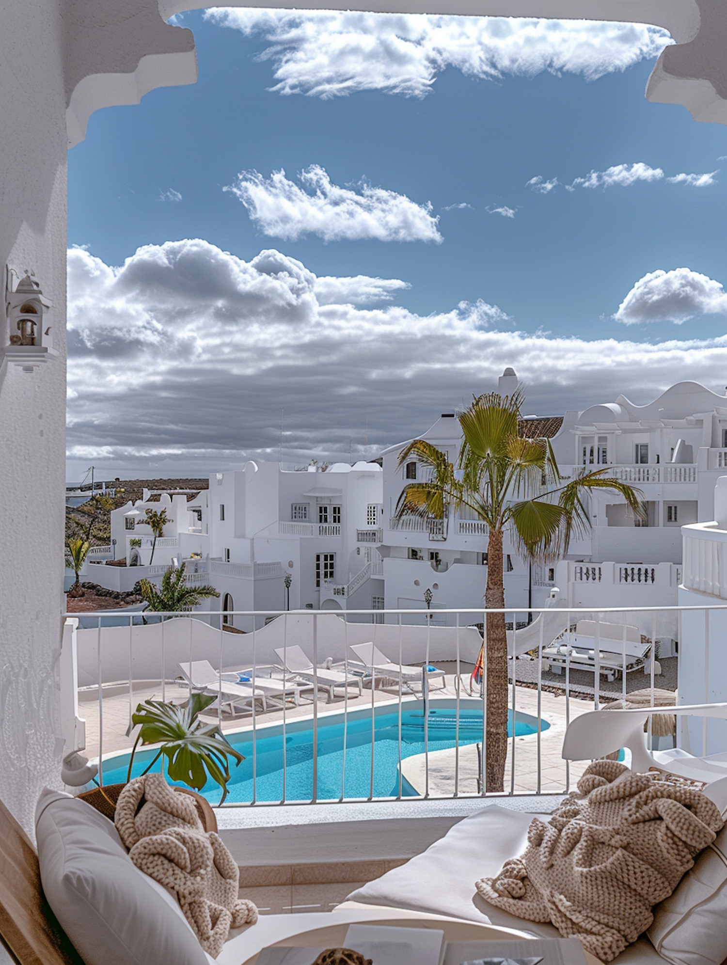 Cozy balcony view of a pool and white buildings under a blue sky with clouds. Relaxing Mediterranean vibe with palm trees.