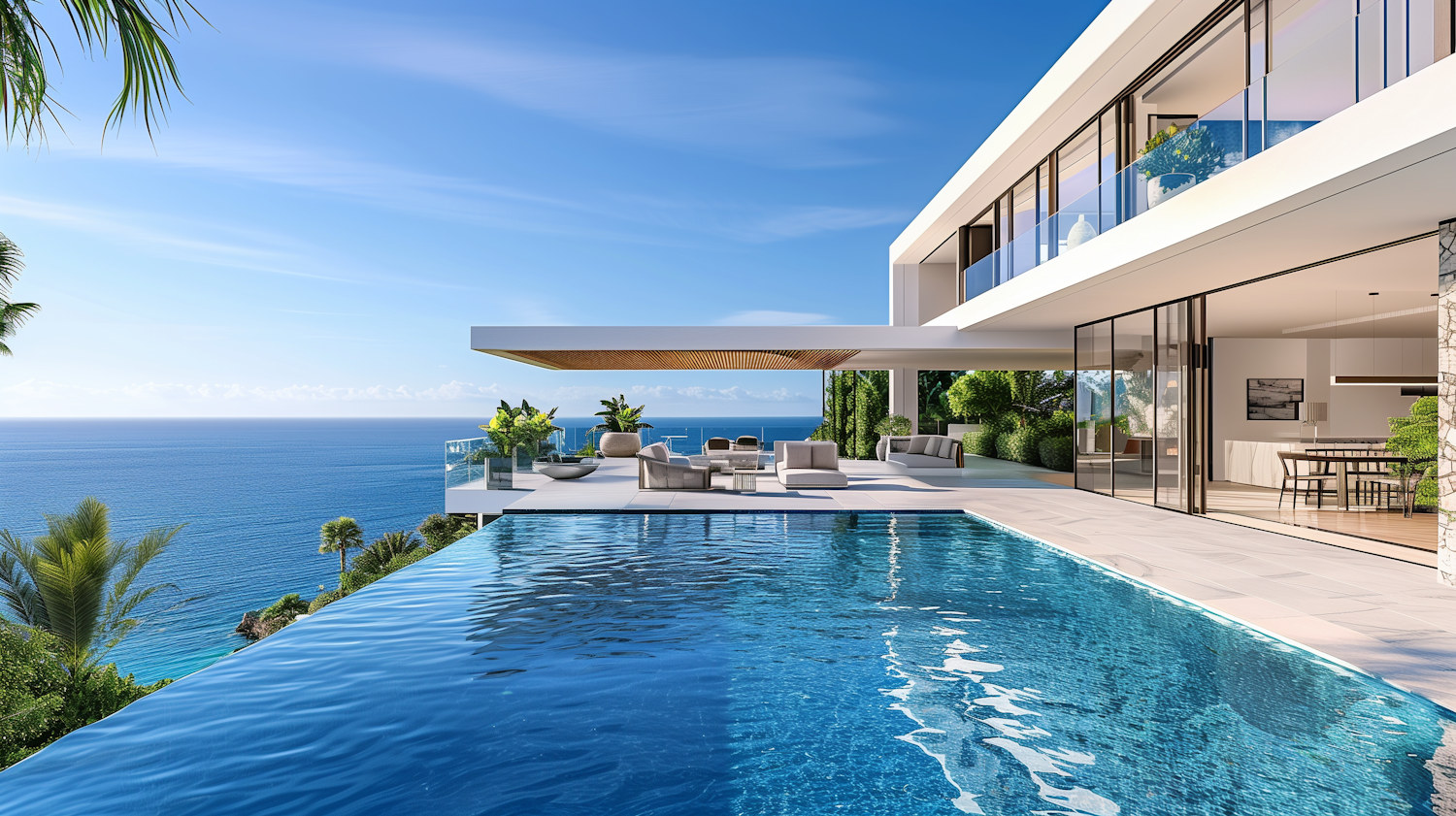 Luxurious modern villa with infinity pool and ocean view, featuring sleek design, glass walls, and elegant outdoor seating.