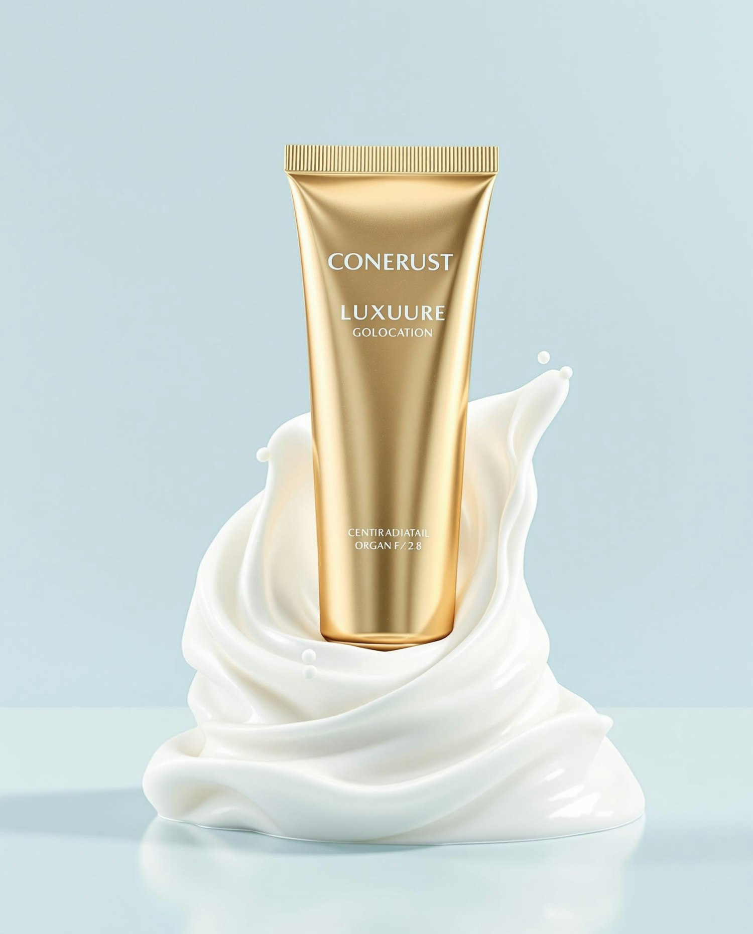 Golden skincare tube surrounded by a swirl of white cream on a pastel blue background, showcasing luxury and elegance.