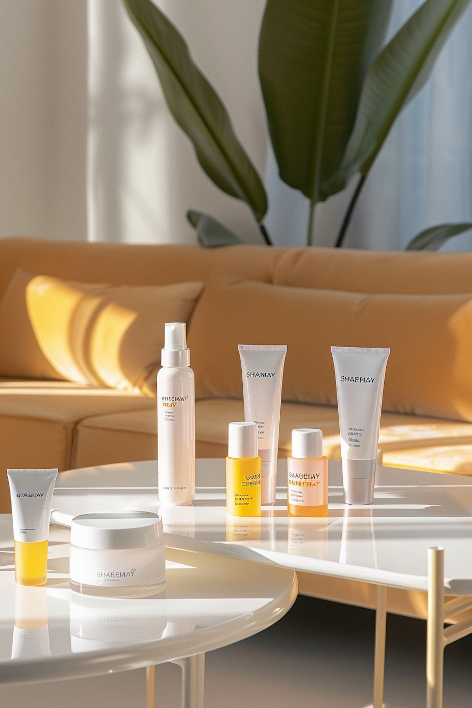 Elegant skincare products on a white table with a mustard sofa and green plant in a sunlit room, creating a serene atmosphere.