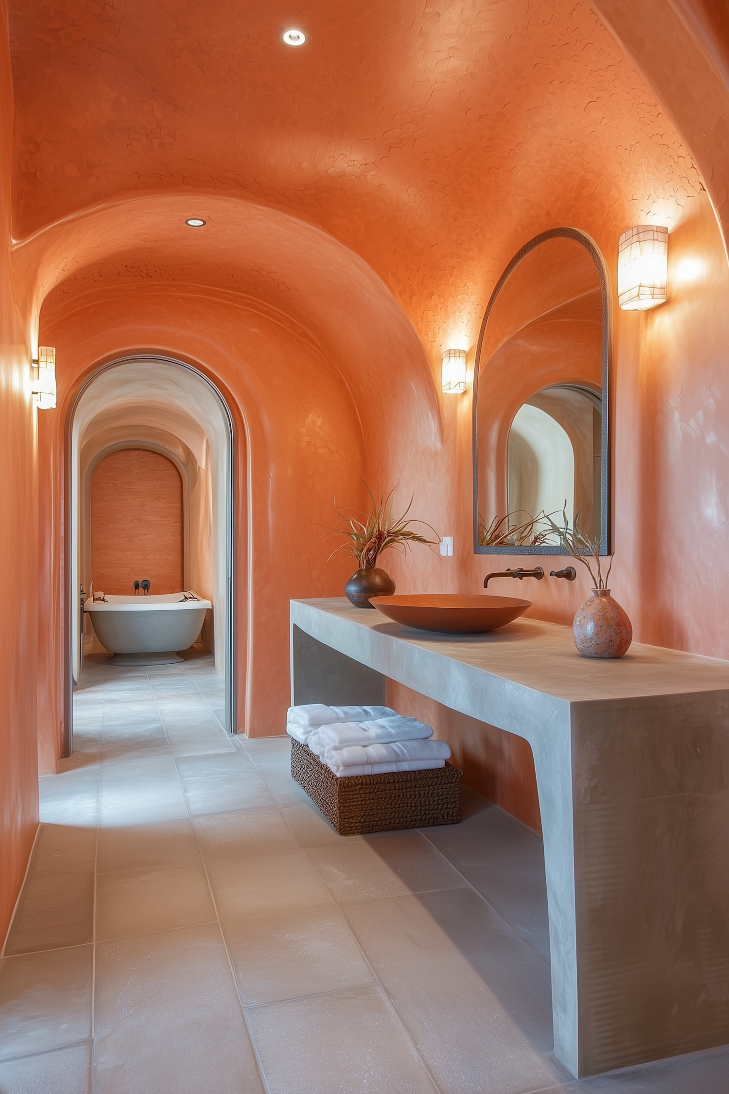 Warm terracotta bathroom with arched ceilings, a freestanding tub, and a sleek concrete vanity. Perfect blend of modern and earthy design.