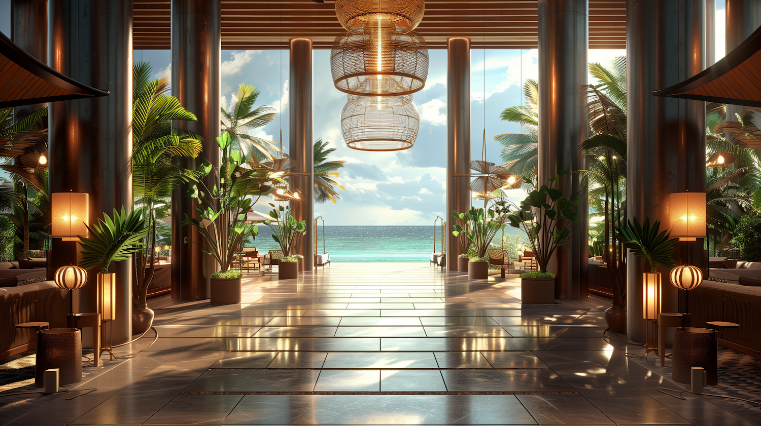 Luxurious open-air lobby with tropical plants, elegant lighting, and a stunning ocean view, creating a serene and inviting atmosphere.