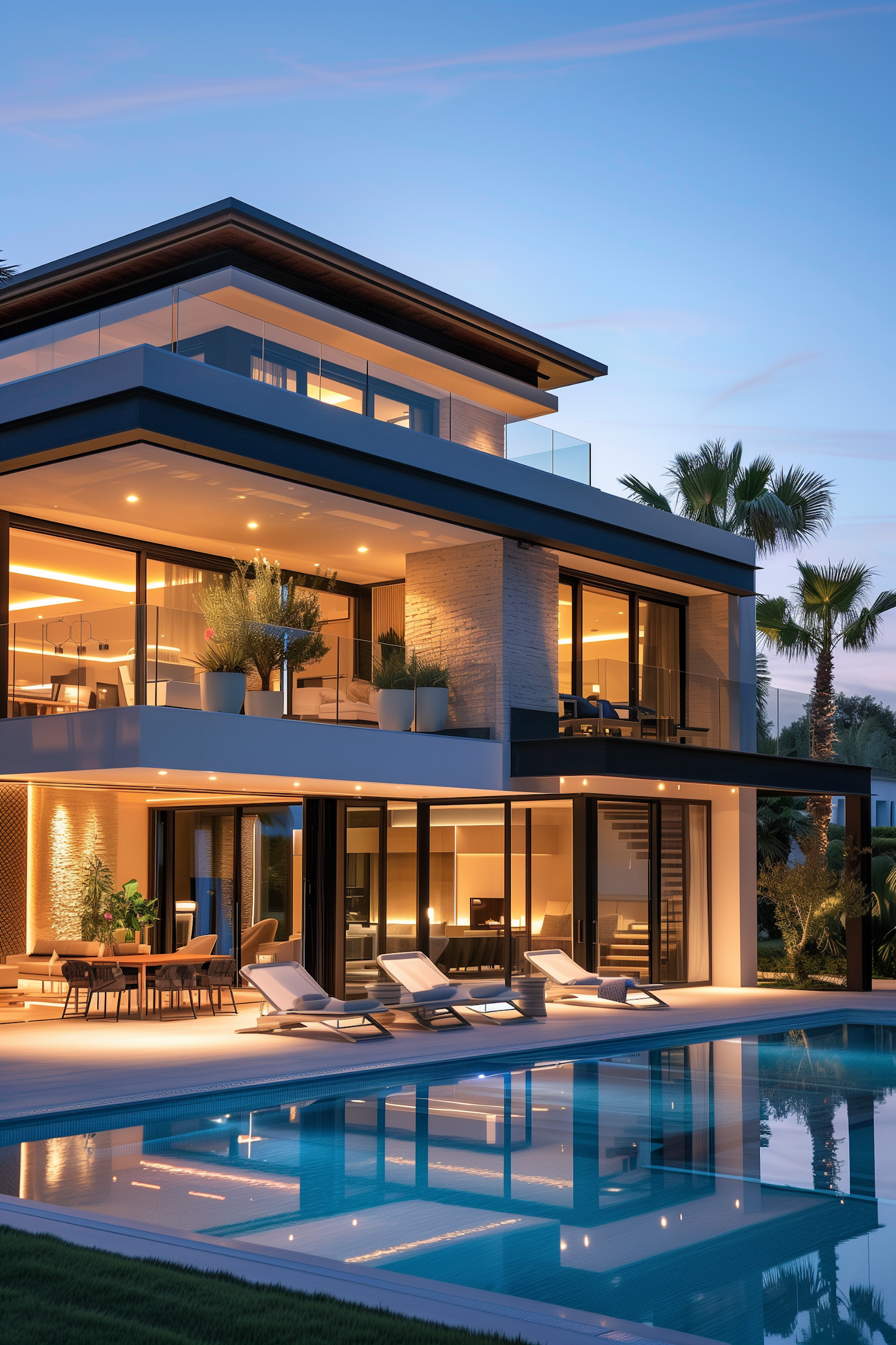 Luxurious modern house with glass walls, poolside lounge chairs, and palm trees, beautifully lit against a twilight sky.