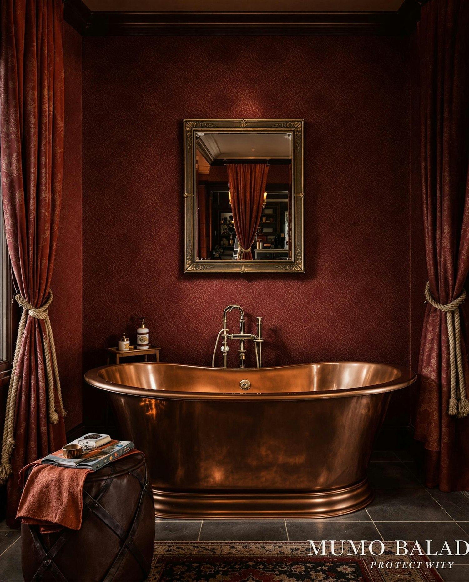 Elegant bathroom with a copper tub, red textured walls, gold-framed mirror, and luxurious decor for a vintage, opulent vibe.