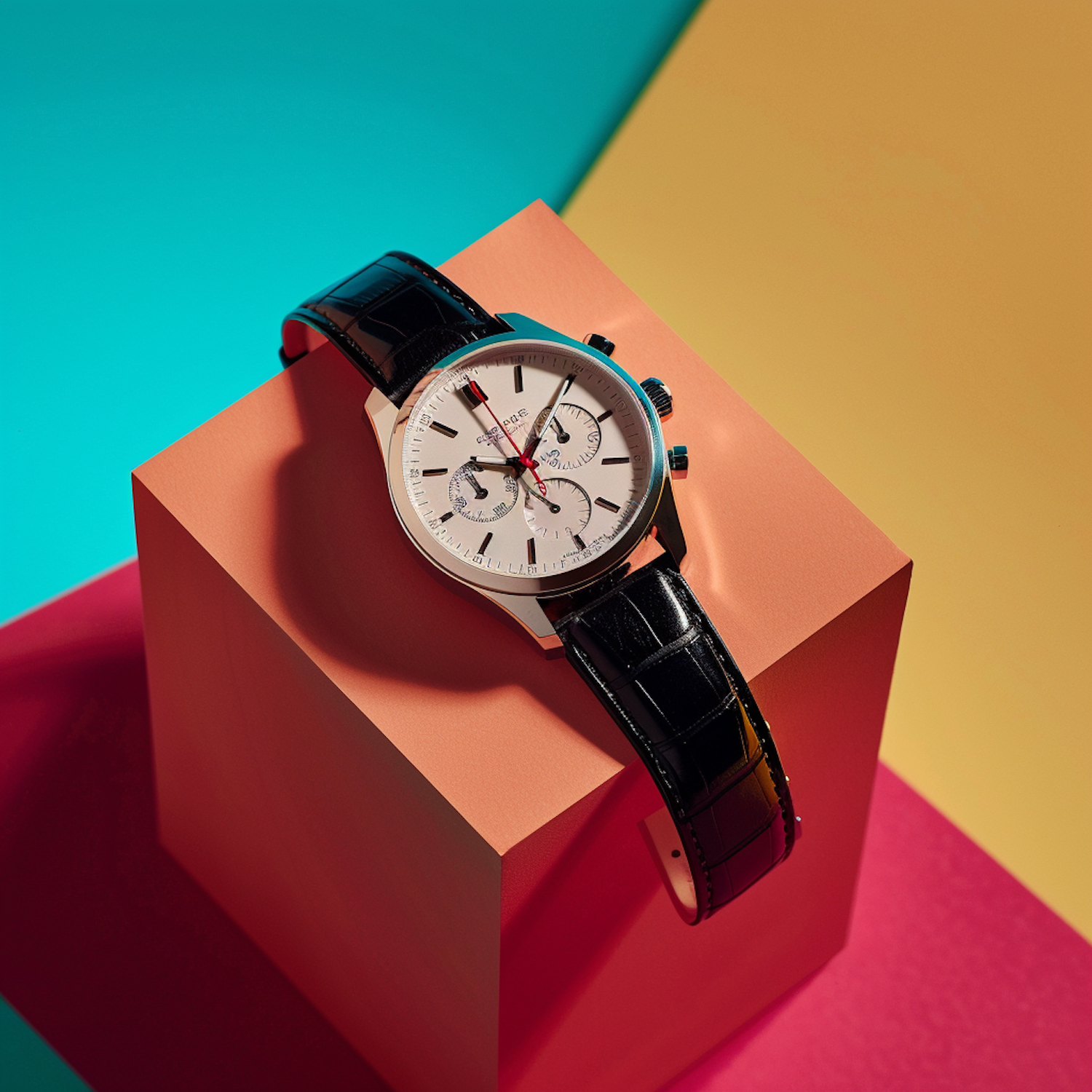 Elegant wristwatch with black leather strap on a colorful geometric background, featuring a silver case and chronograph dials.