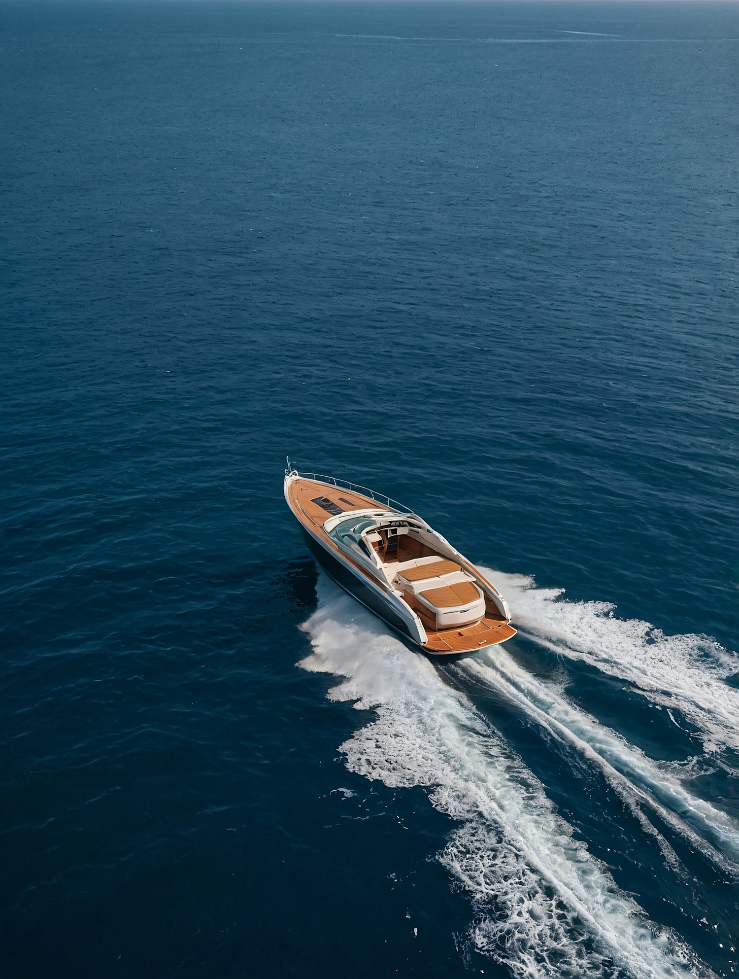 Luxurious motor yacht cruising on a calm blue ocean, leaving a trail of white waves. Sleek design with a polished wooden deck and spacious seating.