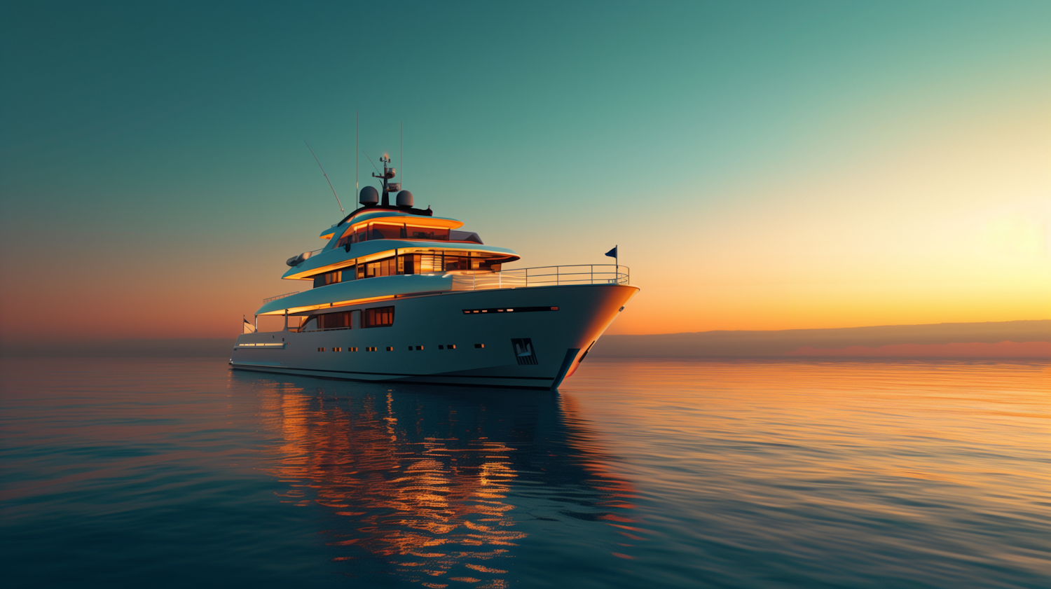 Luxurious yacht at sunset, gliding on calm waters with a vibrant sky. Elegant design and ambient lighting create a serene atmosphere.