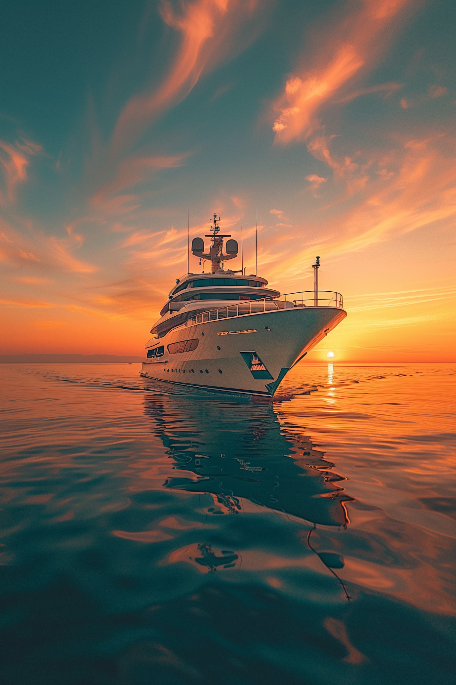Luxurious yacht sailing at sunset with vibrant sky and calm sea, reflecting golden hues and creating a serene, opulent scene.