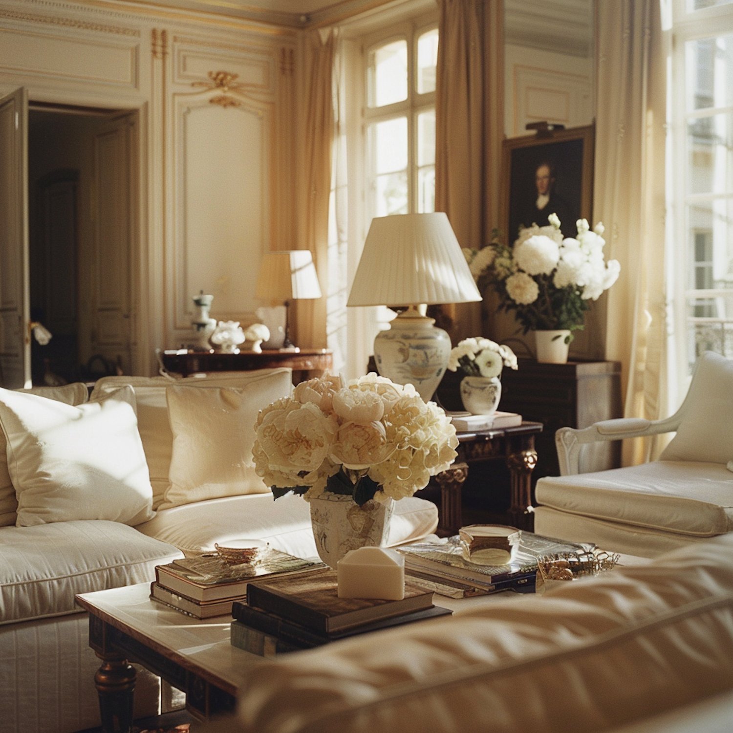 Elegant living room with cream sofas, floral decor, and classic wooden furniture bathed in warm natural light.