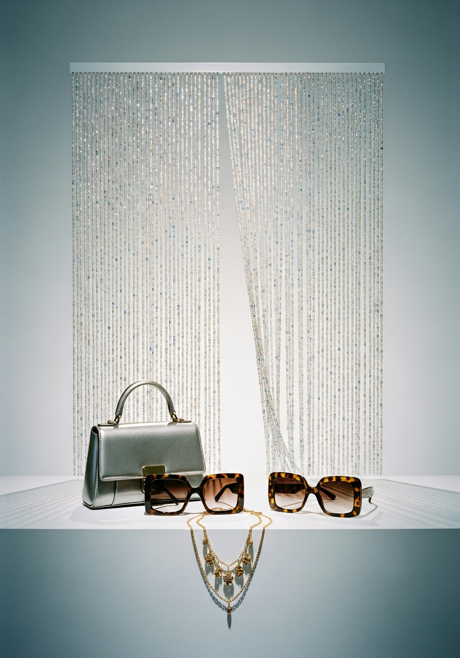 A chic display of a silver handbag, tortoiseshell sunglasses, and a gold necklace against a shimmering beaded curtain backdrop.