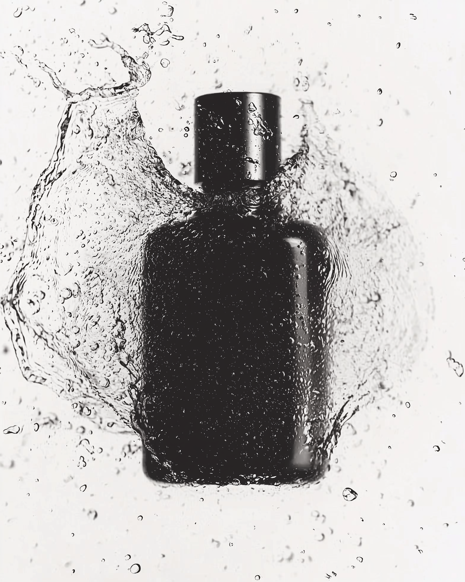 Sleek black bottle mid-splash with dynamic water droplets, creating a fresh and luxurious vibe against a clean white background.