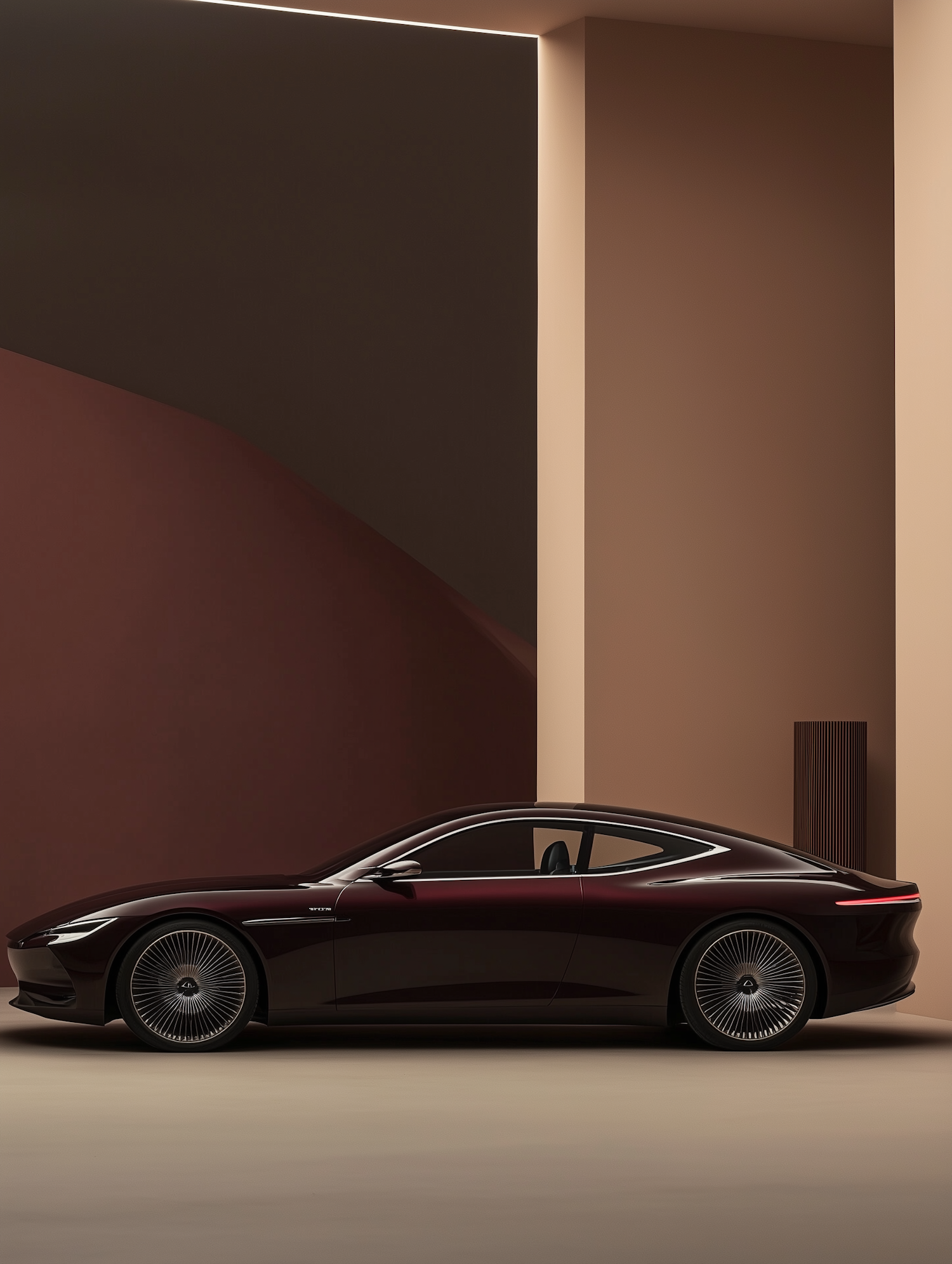 Sleek burgundy luxury car with multi-spoke rims in a minimalist beige and brown indoor setting, exuding elegance and modern design.