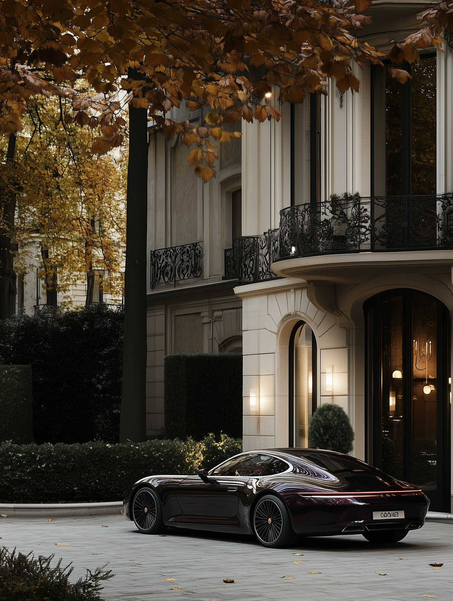 Sleek black car parked in front of an elegant building with autumn leaves and ornate iron railings, creating a luxurious scene.