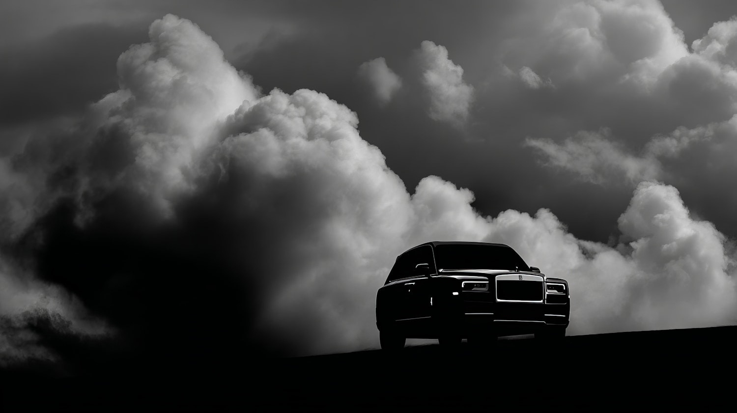 A luxury car silhouetted against dramatic clouds, showcasing sleek design and elegance in a striking monochromatic composition.