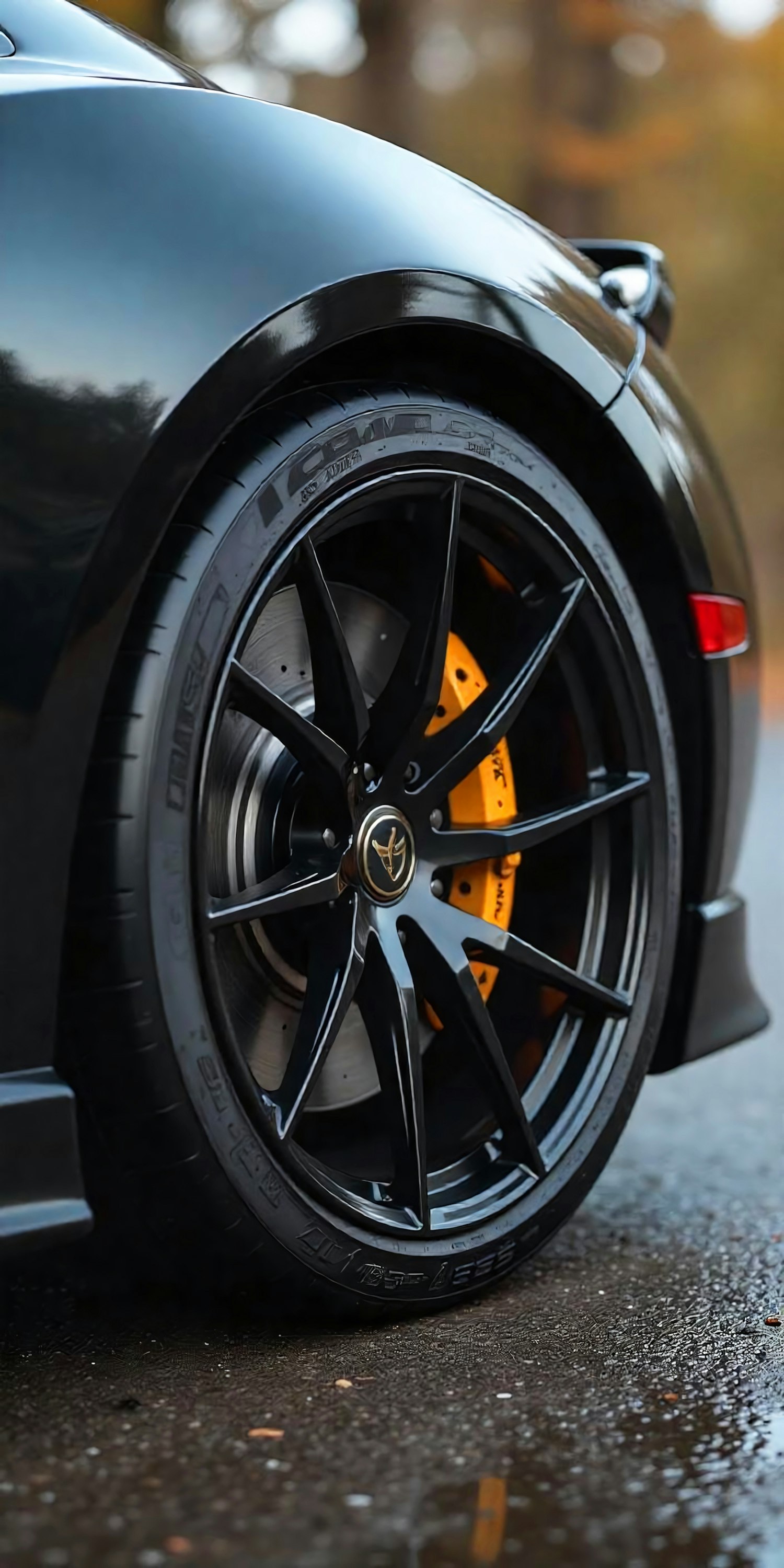 Close-up of a sleek black car wheel with orange brake caliper on wet pavement, highlighting its stylish design and glossy finish.