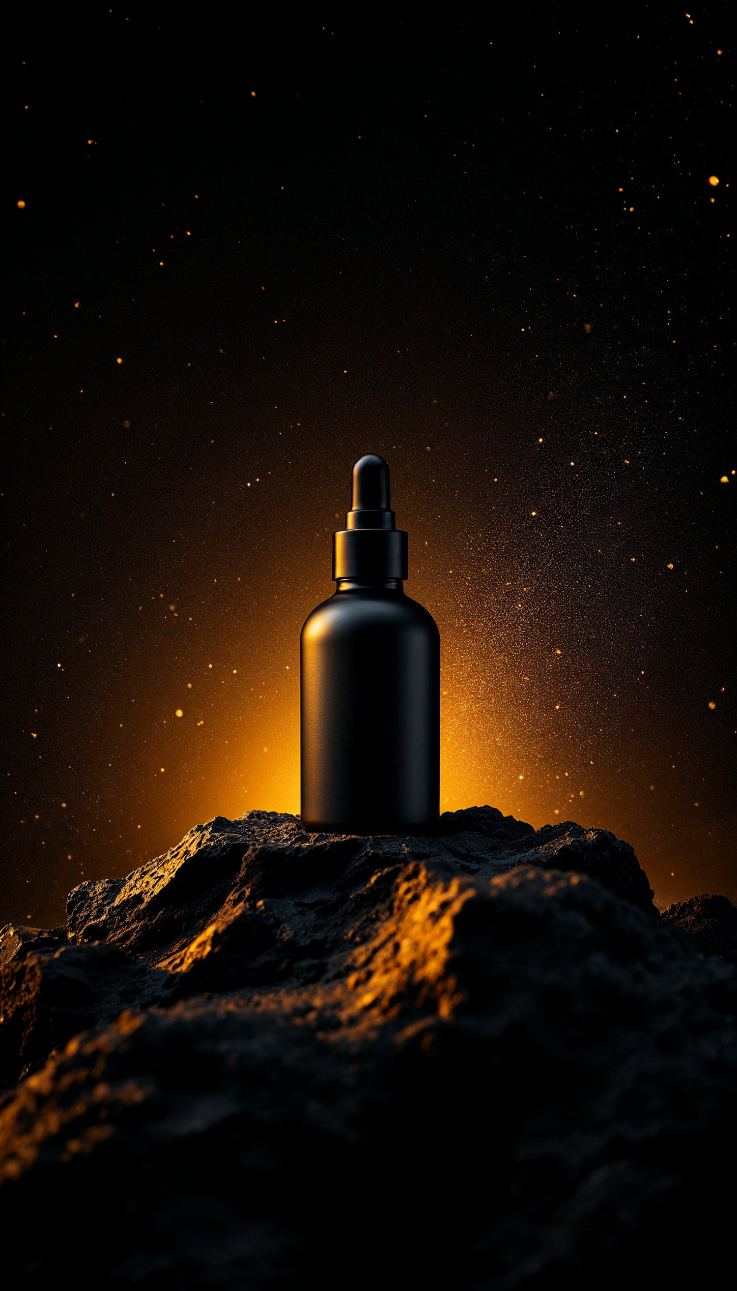 Sleek black dropper bottle on rocky surface with glowing orange backlight, creating an elegant and mysterious atmosphere.