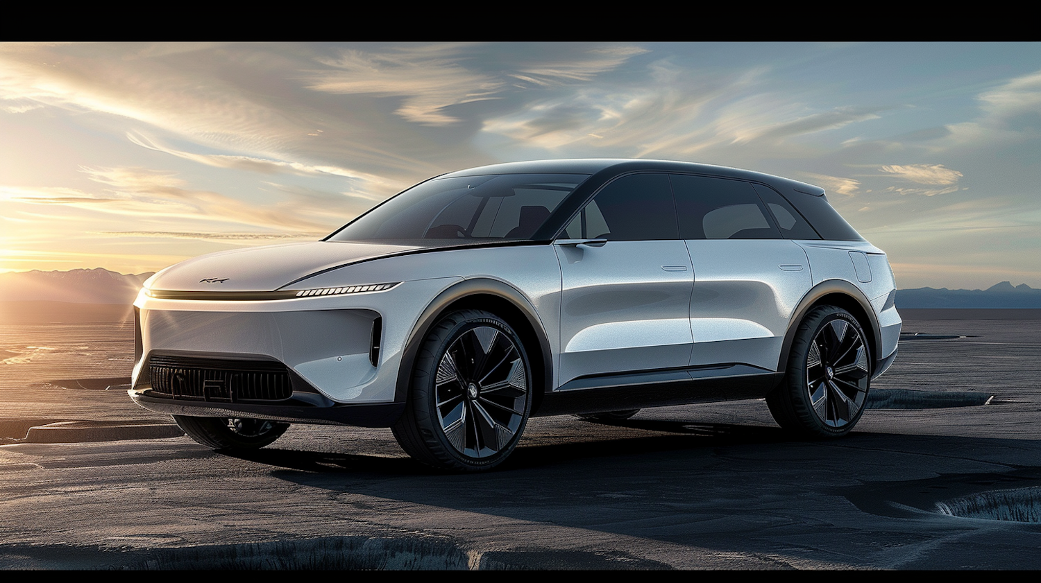 Futuristic silver electric SUV with sleek design and LED headlights, set against a dramatic sunset and open landscape.