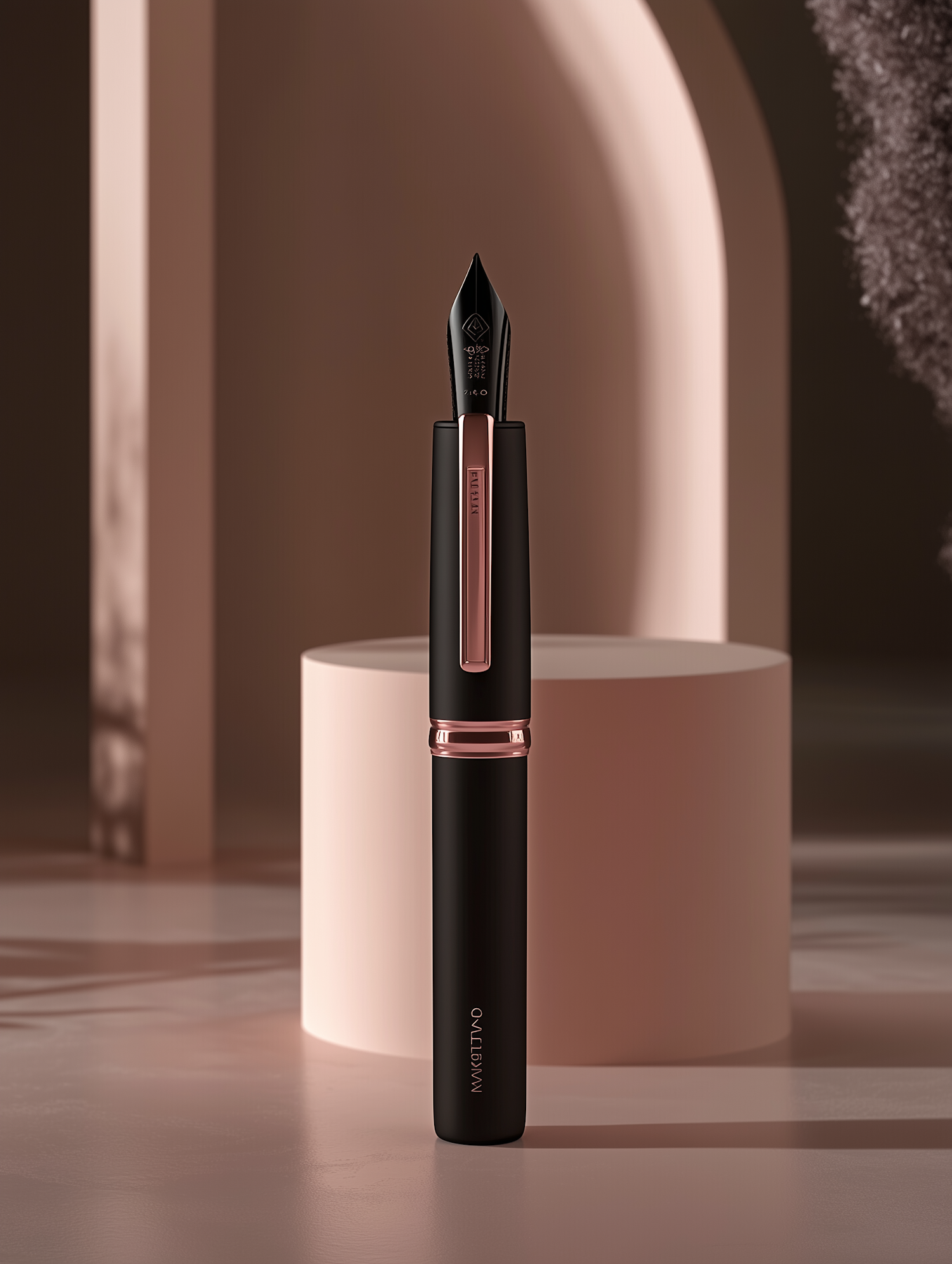 Elegant black fountain pen with rose gold accents, displayed on a minimalist beige pedestal with soft lighting and a modern backdrop.