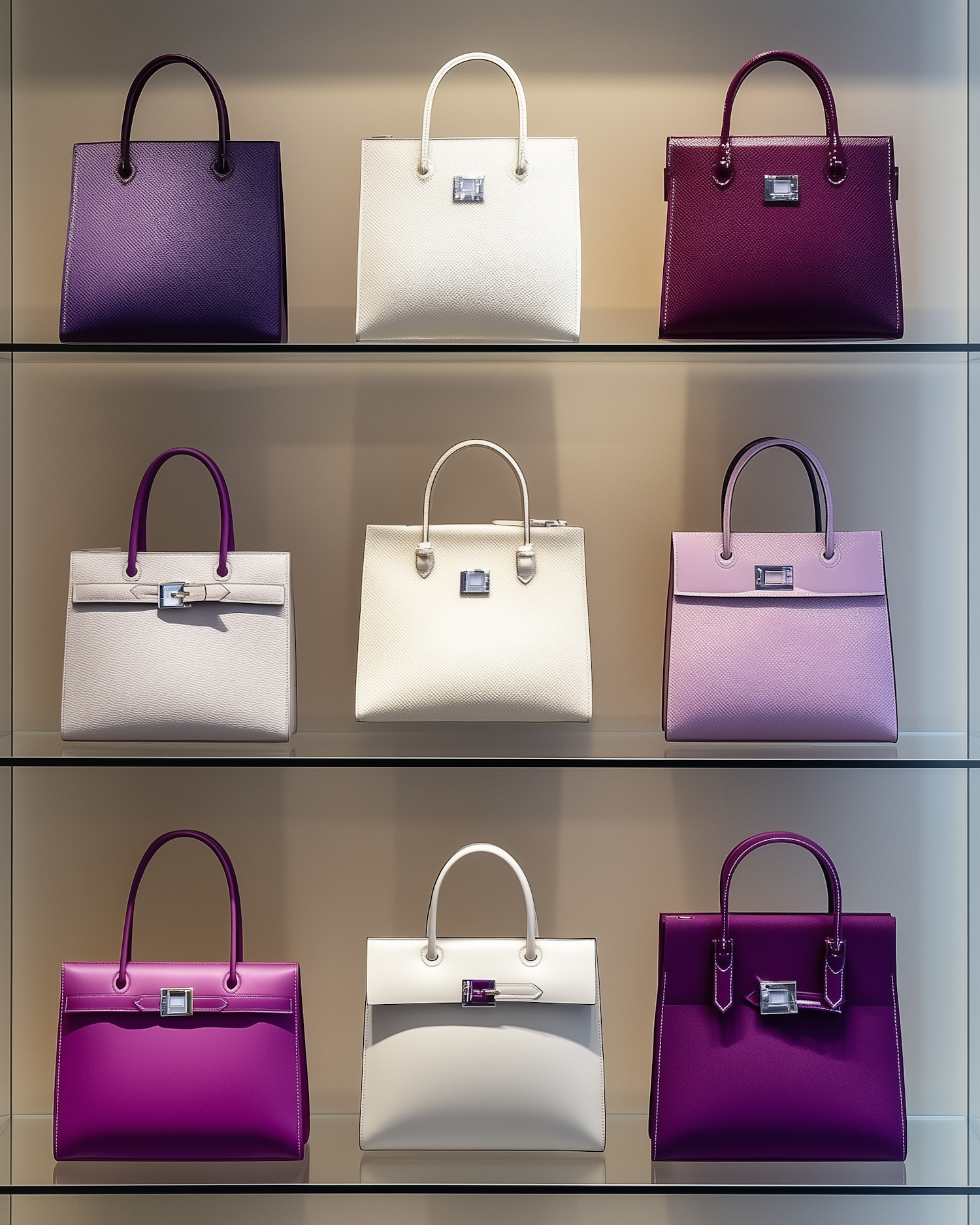 Elegant display of luxury handbags in purple, white, and pink tones, showcasing structured designs and metallic accents.
