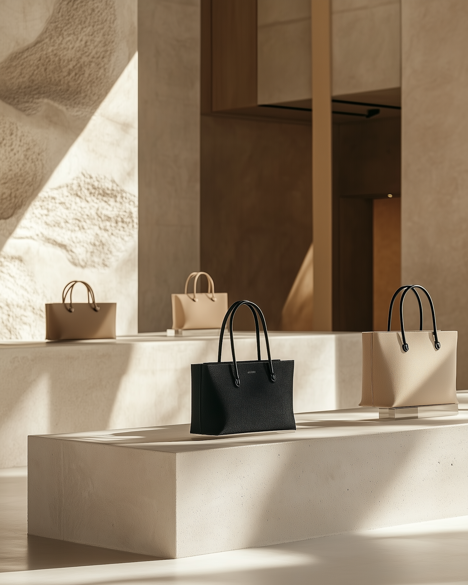 Minimalist luxury handbags in neutral tones displayed on sleek pedestals in a modern, well-lit showroom with soft shadows.