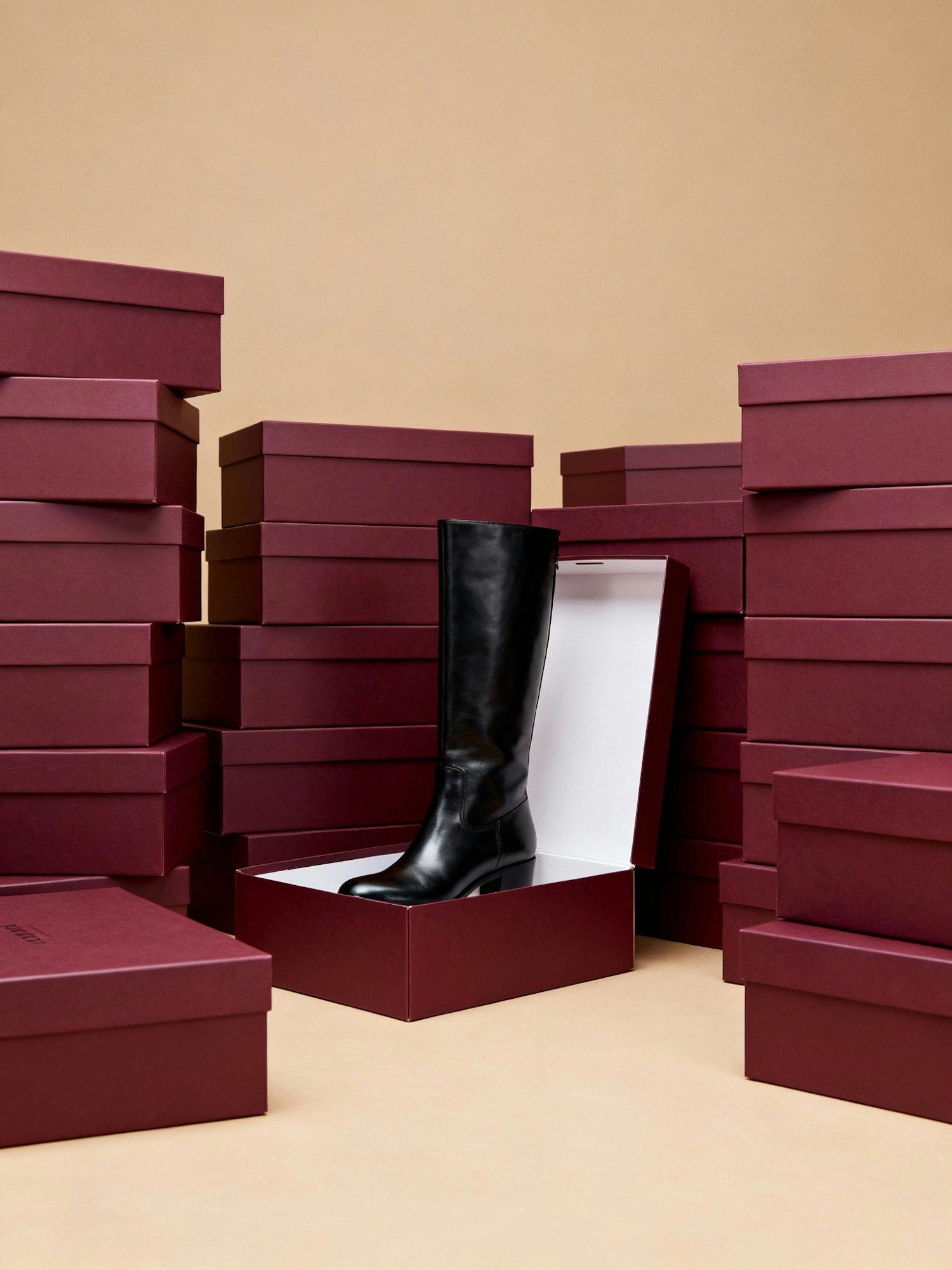high-end fashion editorial photo, minimal photo studio with smooth warm beige solid backdrop, clean and airy composition, soft controlled studio lighting, sharp focus, realistic textures, luxurious yet effortless atmosphere, refined styling, professional fashion photography, consistent minimal studio setup, photorealistic — stacks of plain bordeaux shoe boxes with no logos or text, perfectly aligned, one box open at the center with a pair of sleek black leather knee-high boots elegantly protruding, strong graphic composition