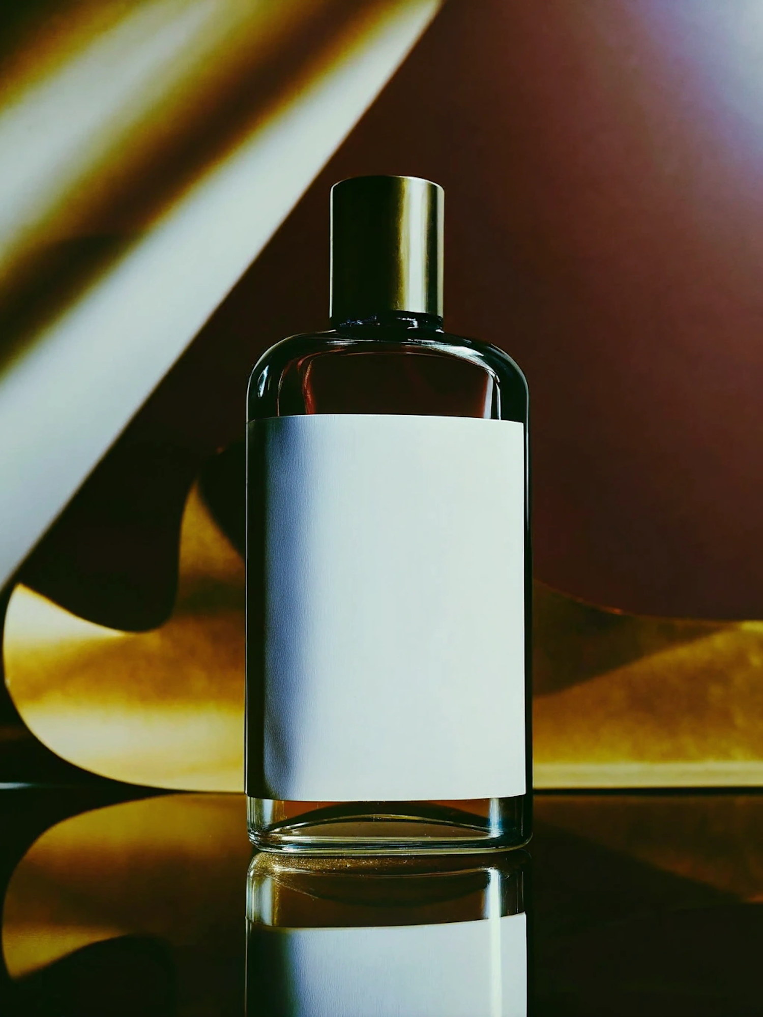 Minimalist glass perfume bottle with a gold cap and blank label, set against a warm golden-brown background with elegant lighting.