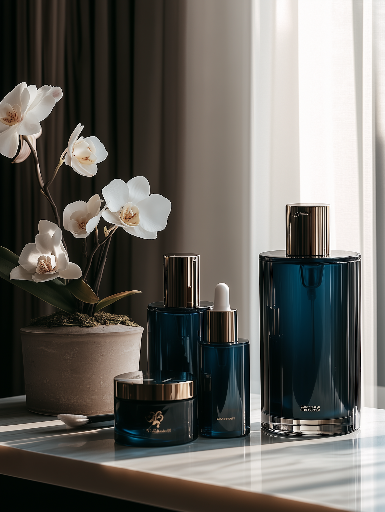 Elegant blue and gold skincare bottles with a white orchid on a glossy table, bathed in soft natural light for a serene vibe.