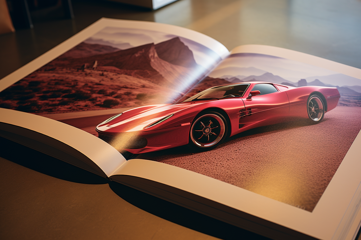 Open magazine showcasing a sleek red sports car on a desert road with mountains in the background, highlighting speed and adventure.