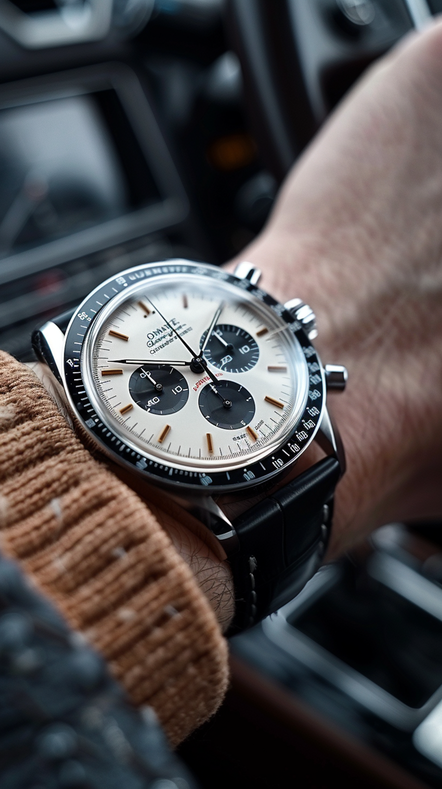 Elegant wristwatch with cream dial and black subdials, set against a car interior. Timeless design with a tachymeter bezel.