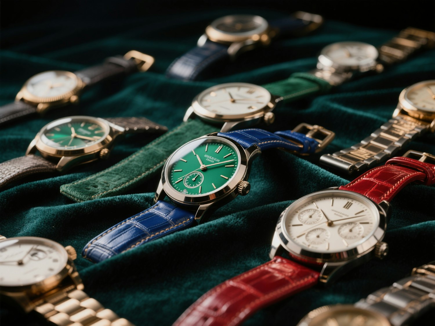 A stunning collection of luxury watches with colorful straps and elegant designs displayed on a green velvet surface.