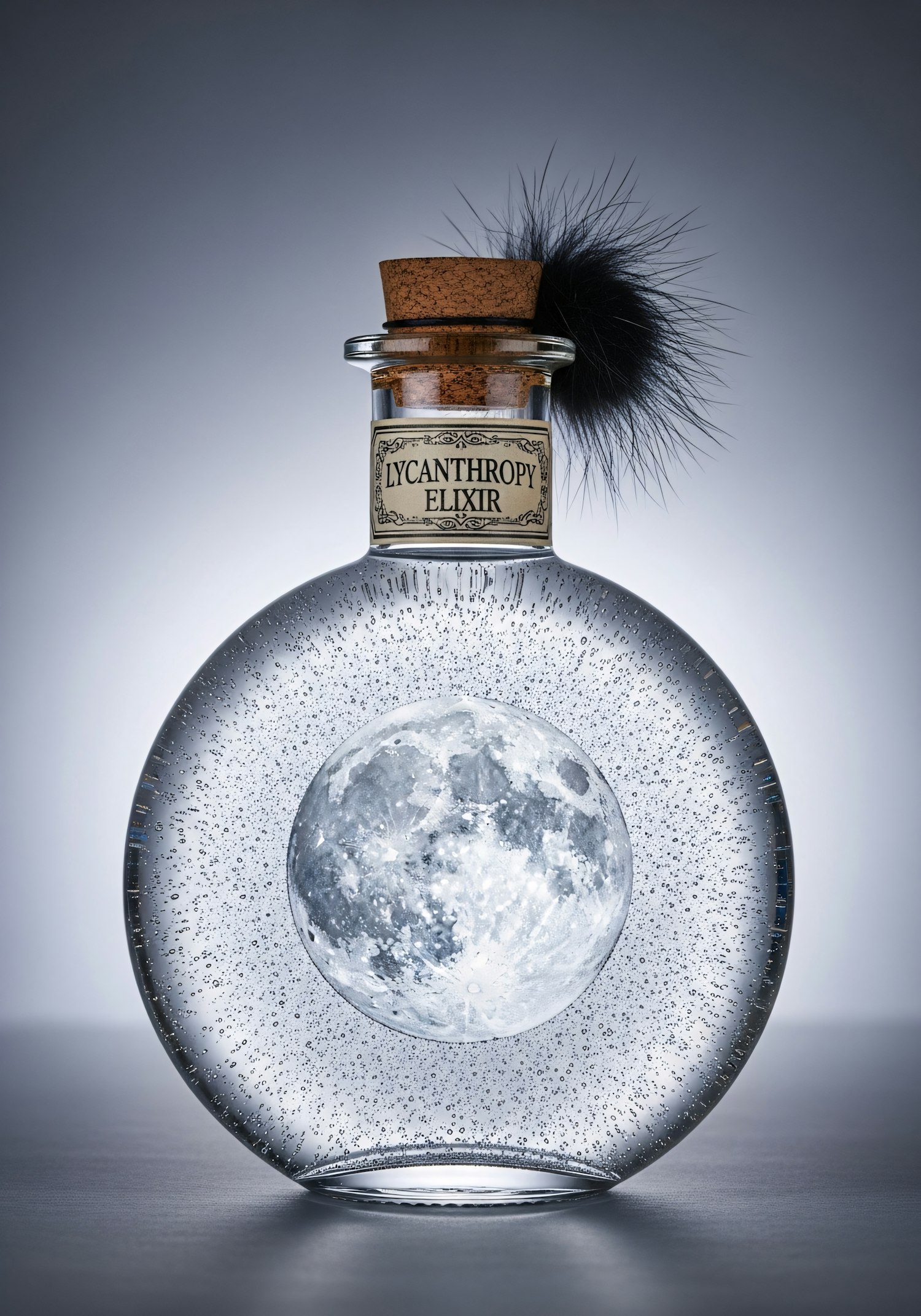 A mystical glass bottle labeled 'Lycanthropy Elixir' with a moon design inside, suspended bubbles, and a tuft of fur on the cork.