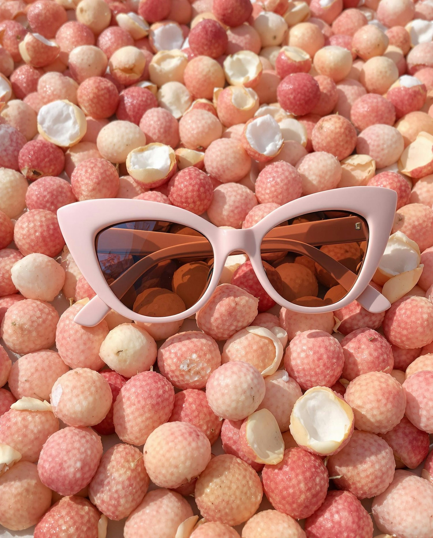 Stylish pink cat-eye sunglasses resting on a bed of ripe, peeled lychee fruits, highlighting their soft textures and vibrant colors.