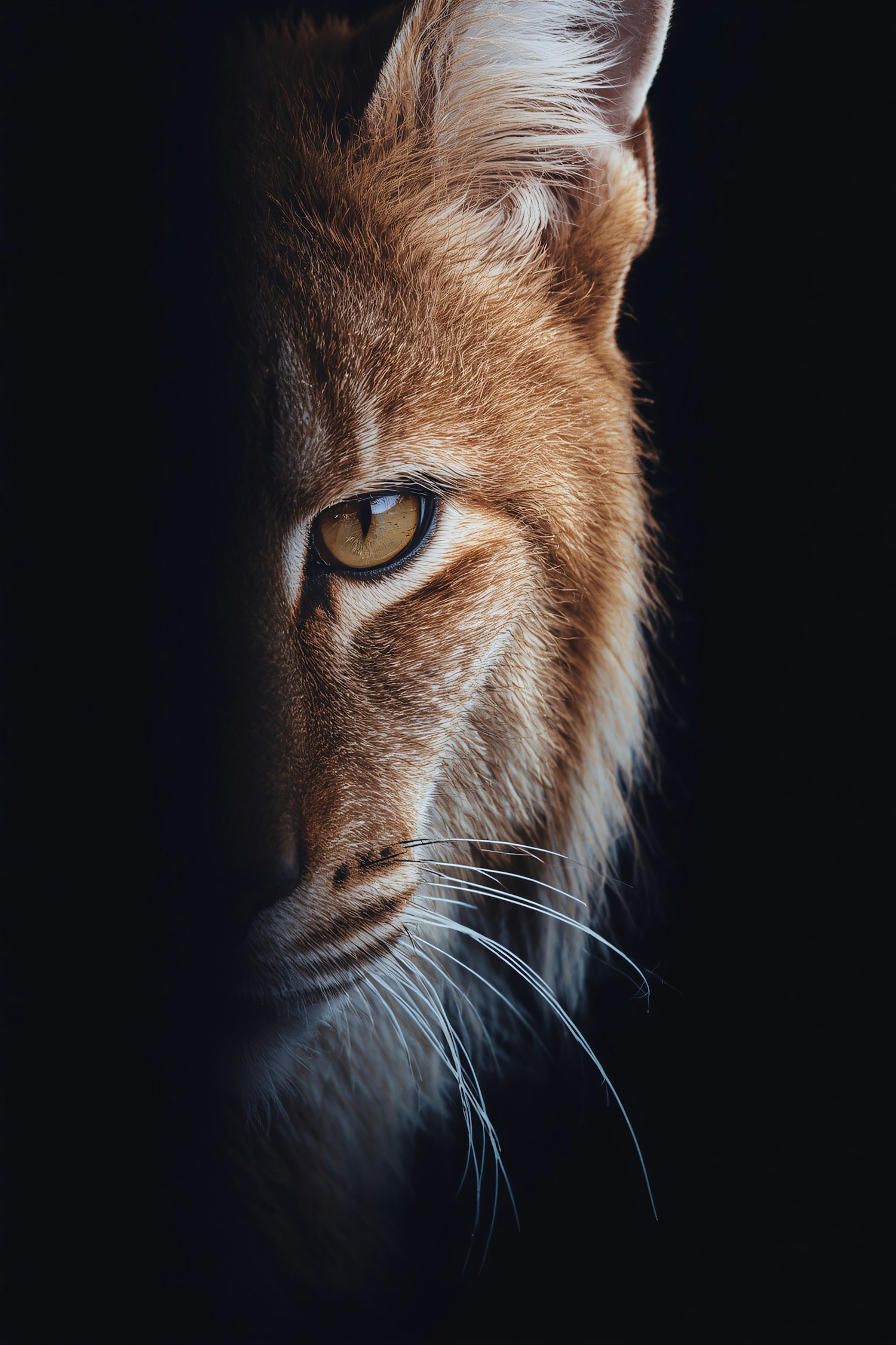 Close-up of a lynx's face with golden fur and piercing yellow eyes, dramatically lit against a dark background.