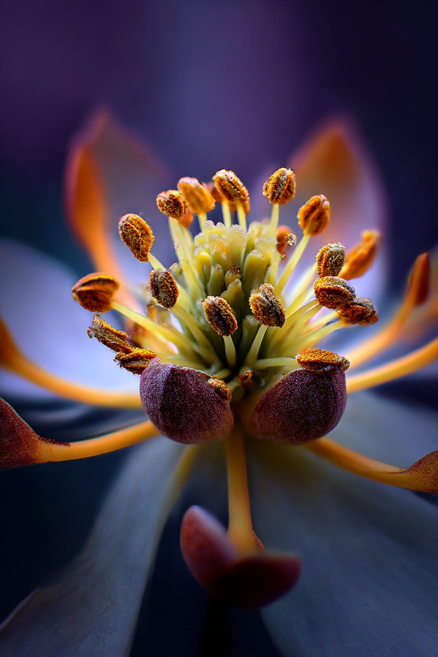 Macro shot of a flower's center, highlighting vibrant orange stamens and a detailed pistil against a soft, blurred background.