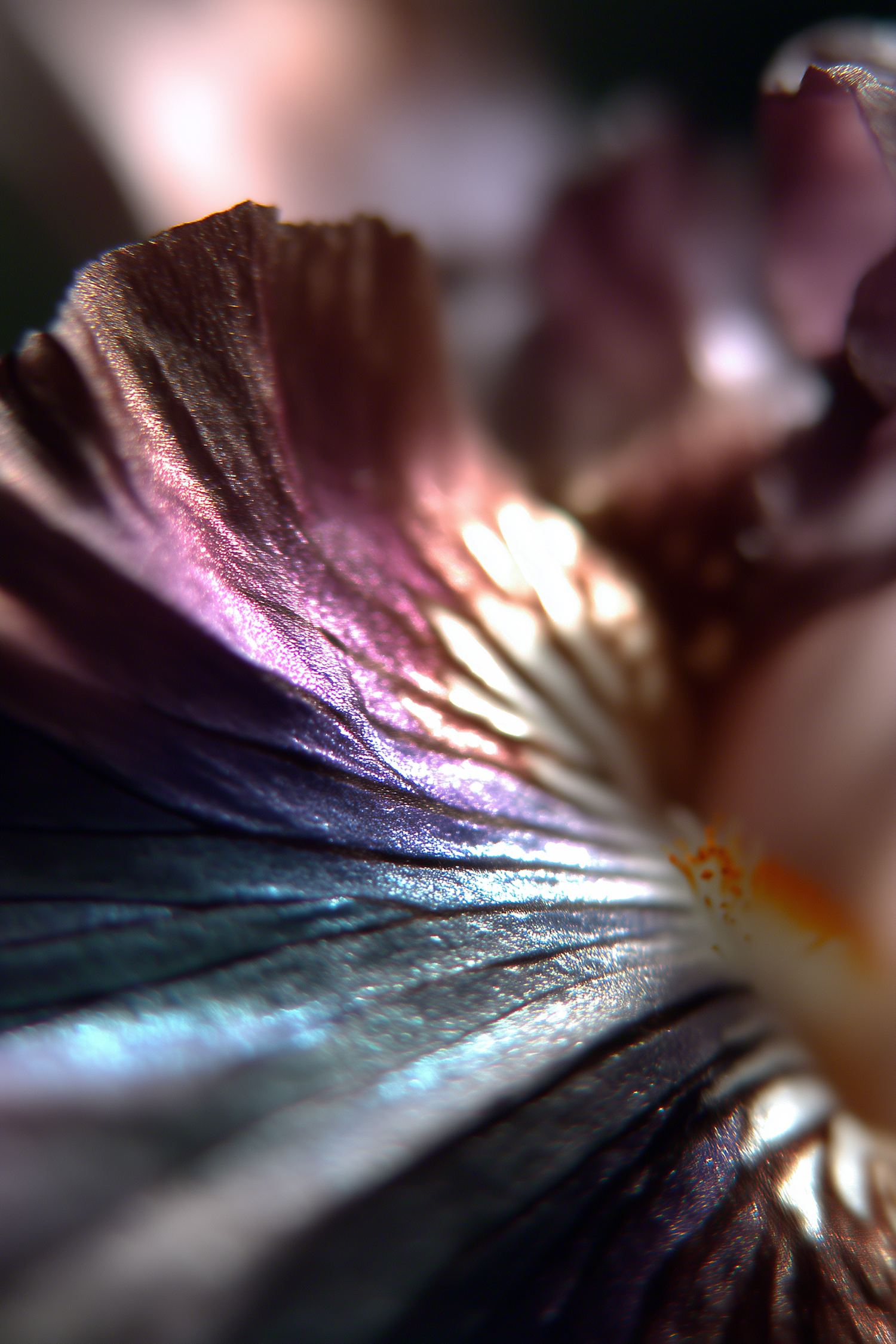 Macro shot of an iris petal with shimmering purple, blue, and metallic hues, showcasing intricate textures and vibrant light reflections.