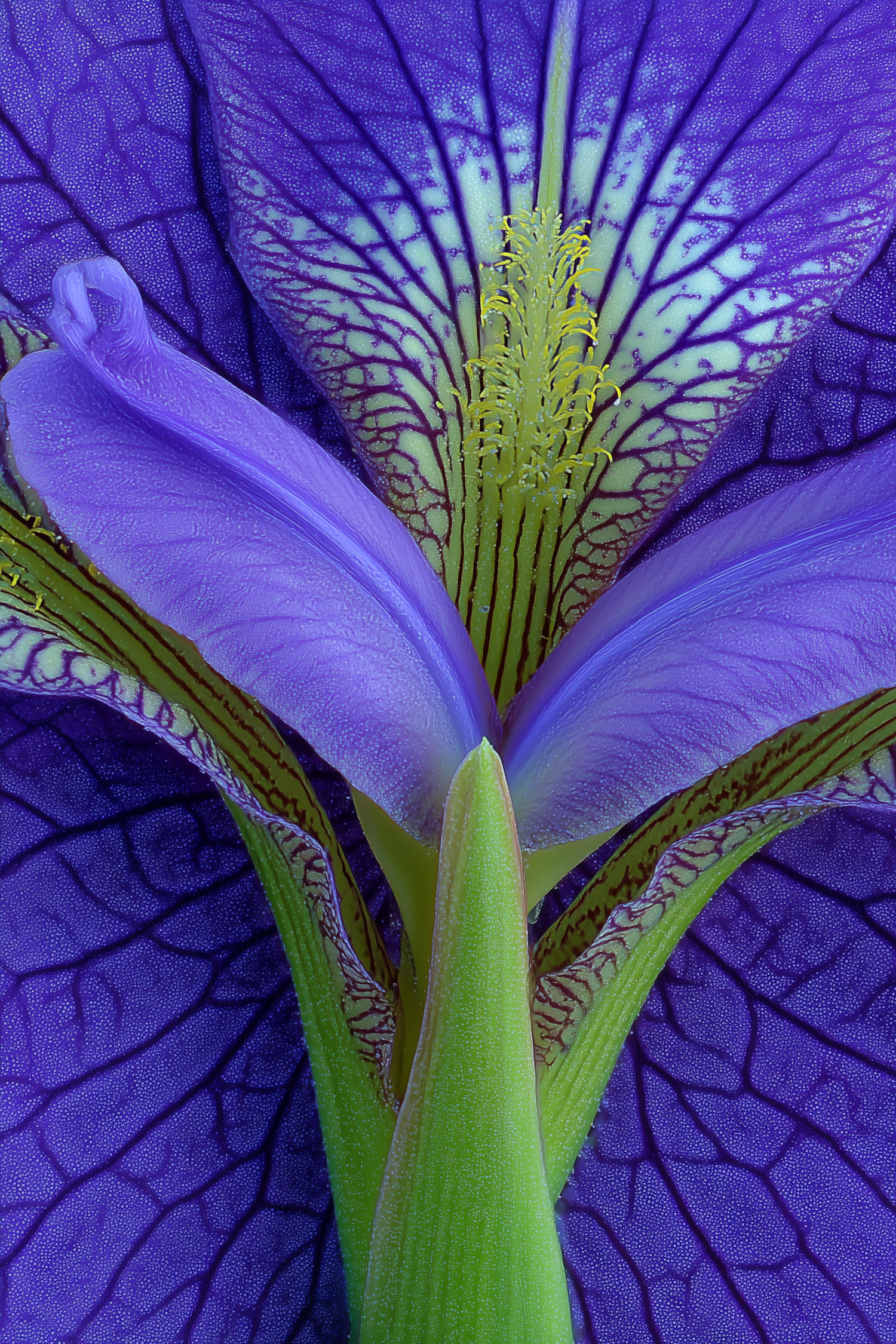 Stunning macro shot of a purple iris flower with intricate petal veins and vibrant green and yellow stamen details.