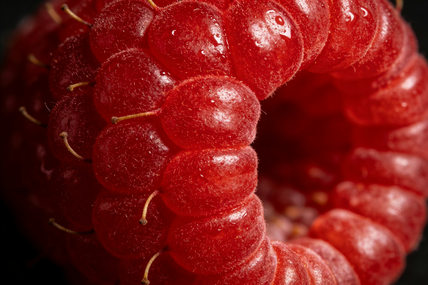 Macro shot of a fresh raspberry, highlighting its vibrant red color, detailed texture, and natural shine against a dark background.
