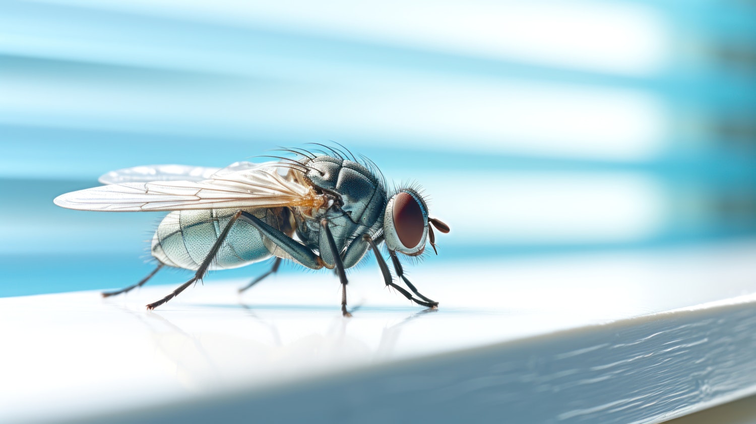 Close-up of a housefly with metallic blue body and red eyes on a white surface, set against a blurred blue background.