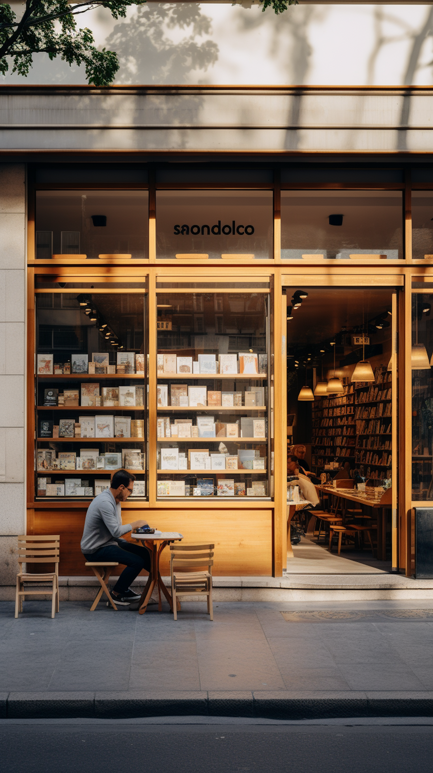 Man reading outside a cozy bookstore with large glass windows and warm lighting. Modern facade with wooden accents and tree shadows.
