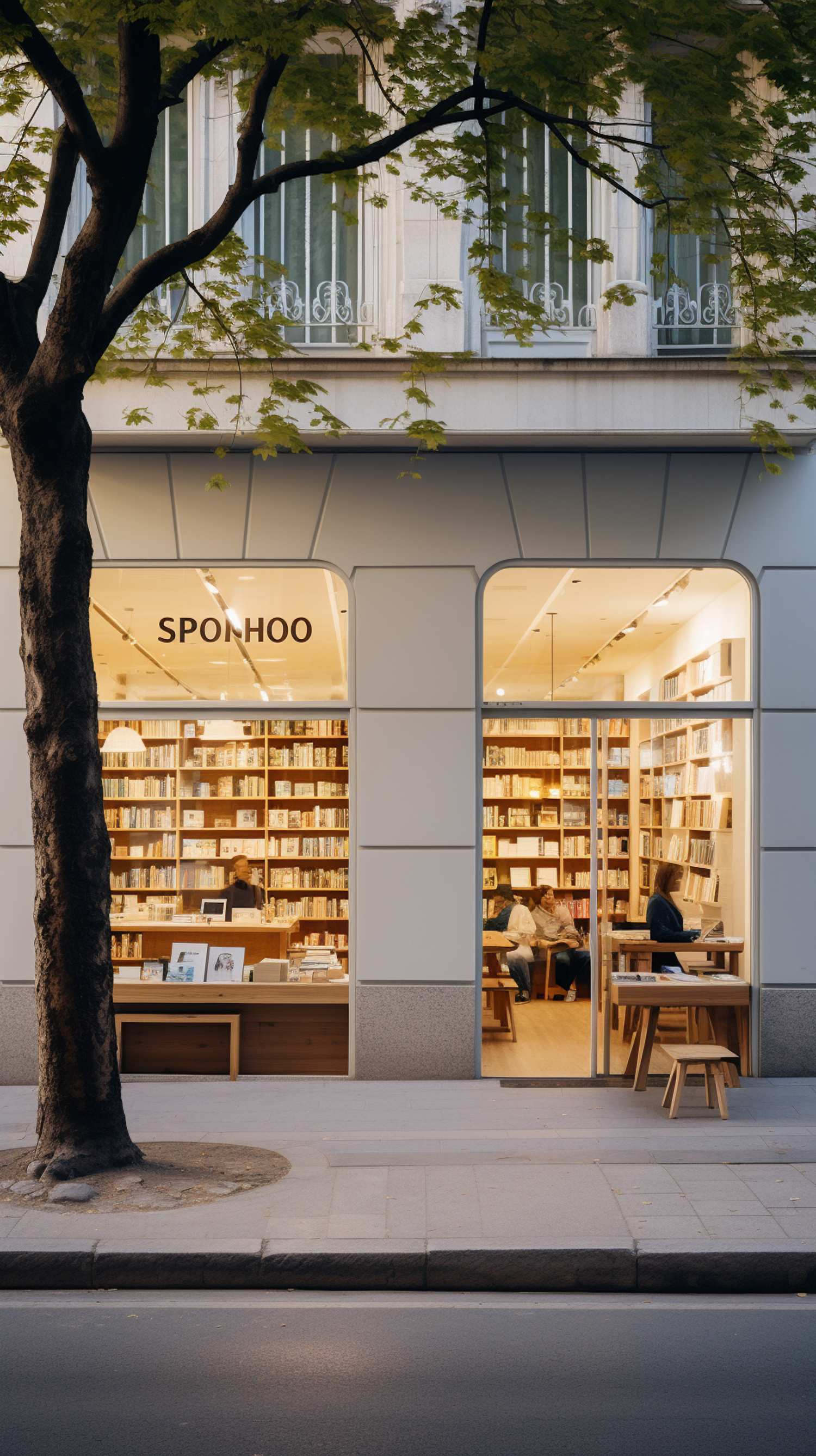 Cozy bookstore with large windows, warm lighting, and people reading inside. Modern facade with a tree adding a natural touch.