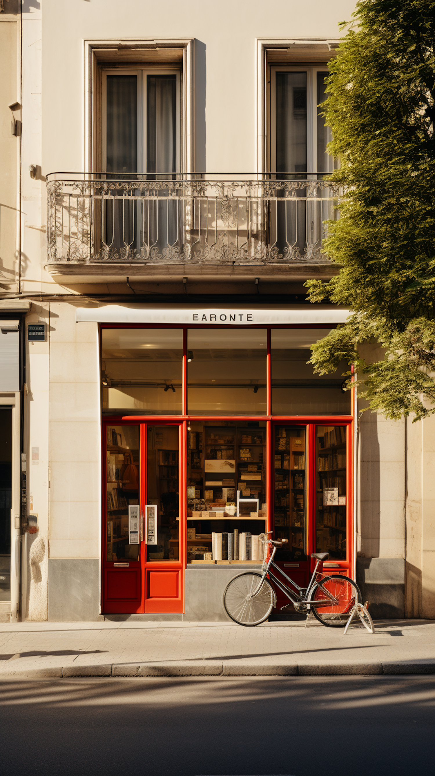 Charming bookstore with red facade and vintage bicycle, set against a cream building with ornate balcony. Inviting and picturesque scene.
