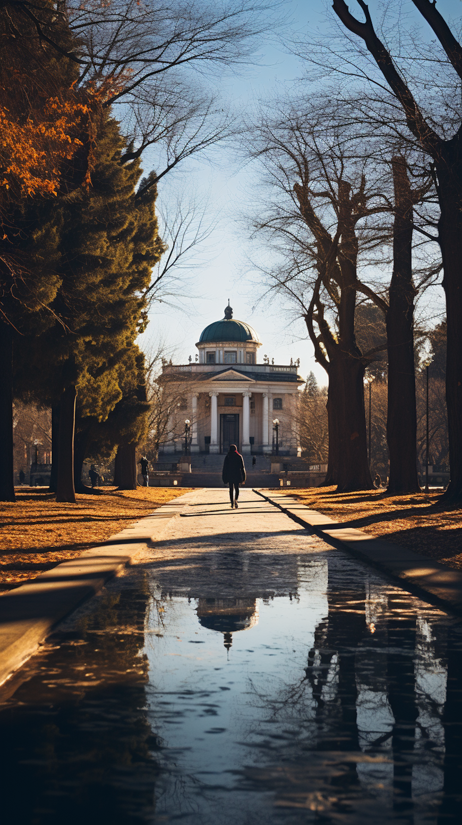 A person walks towards a neoclassical building with a dome, surrounded by trees and a reflective pool, in warm golden light.