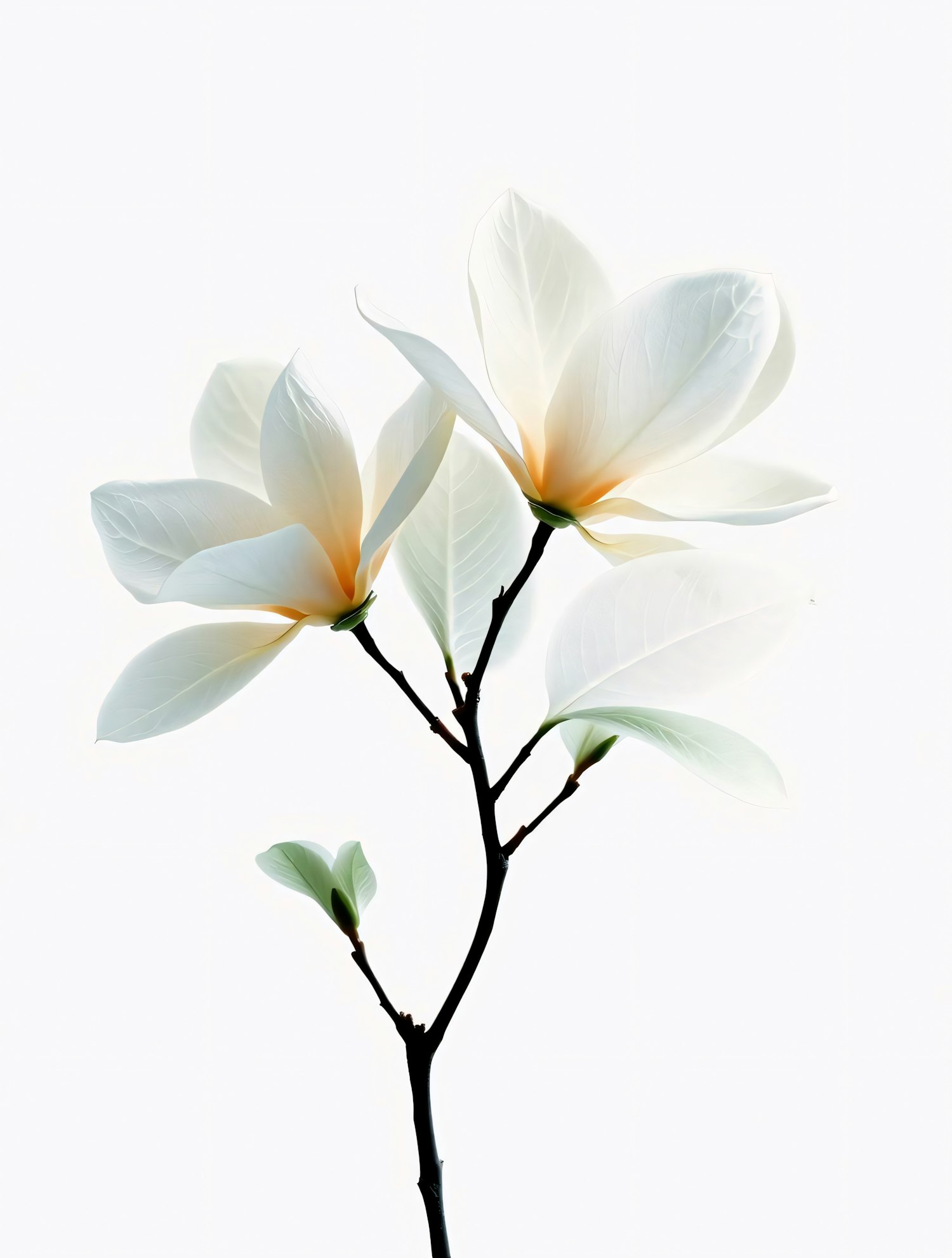 Elegant white magnolia flowers on a dark branch, set against a clean white background, showcasing their delicate beauty and simplicity.