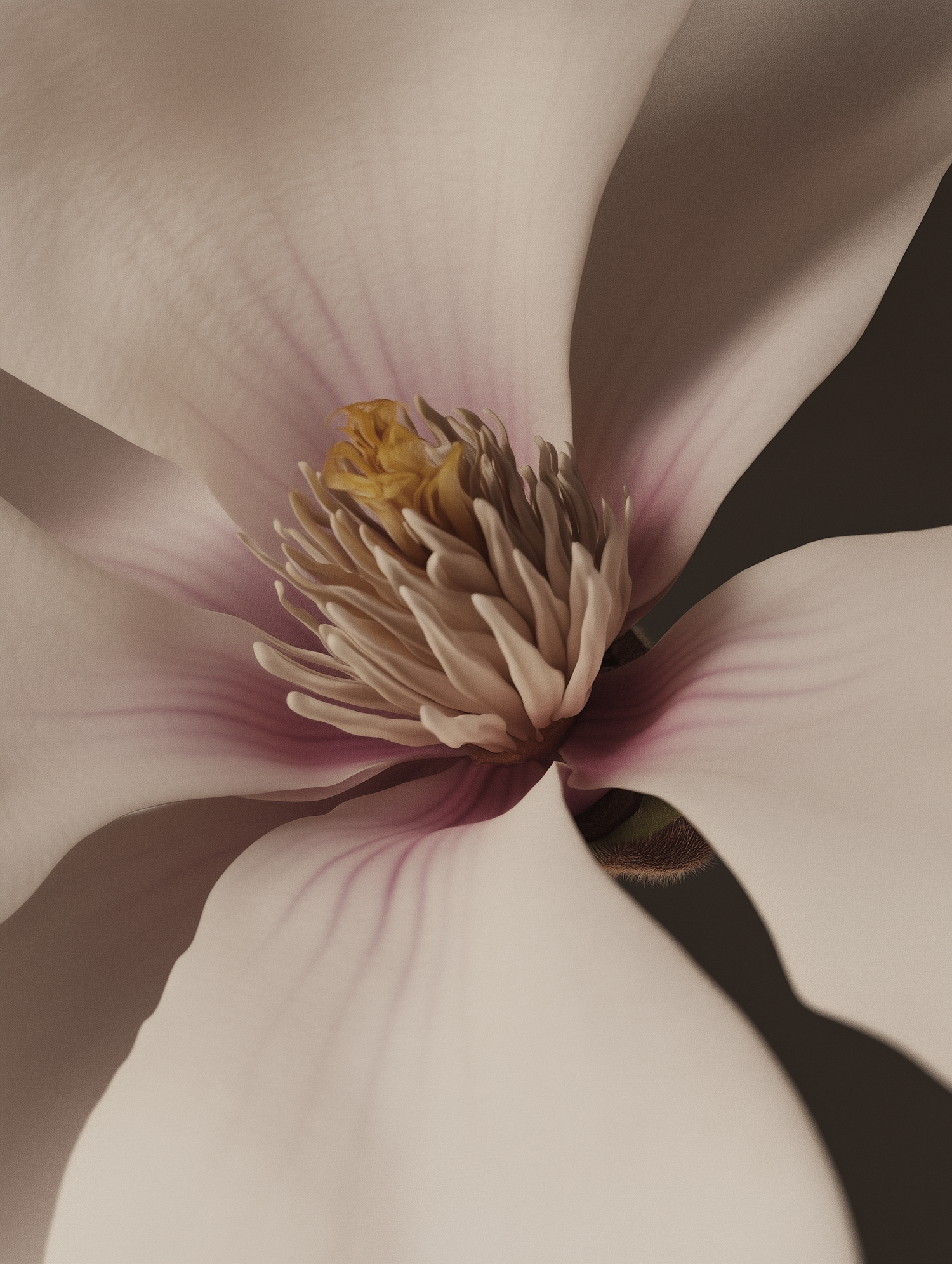 Close-up of a blooming magnolia flower with creamy white petals and pinkish veins, set against a dark blurred background.
