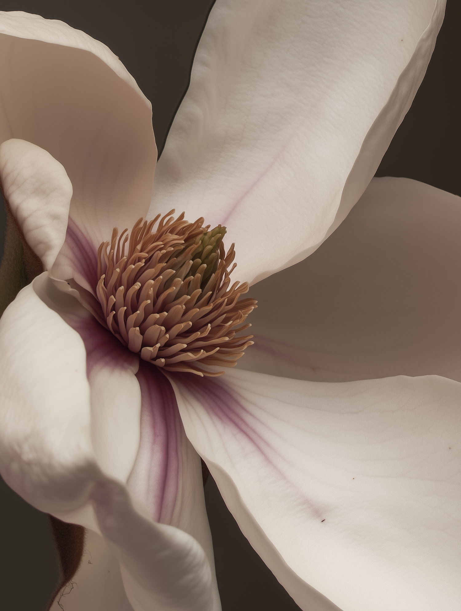 Close-up of a blooming magnolia flower with creamy white petals and pinkish veins, showcasing its intricate stamen cluster.