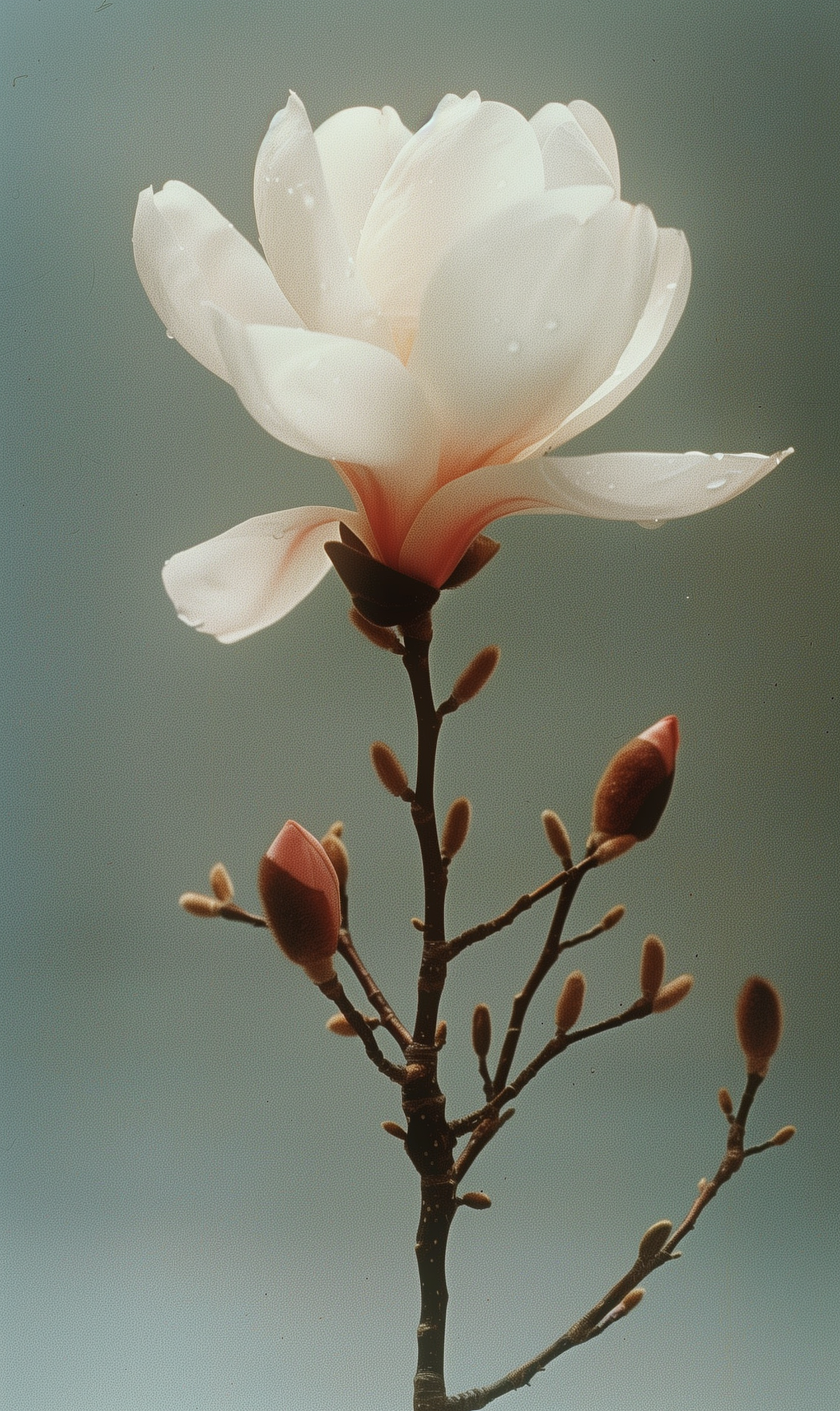 Elegant magnolia flower in full bloom with dewdrops, set against a soft background, showcasing nature's delicate beauty.