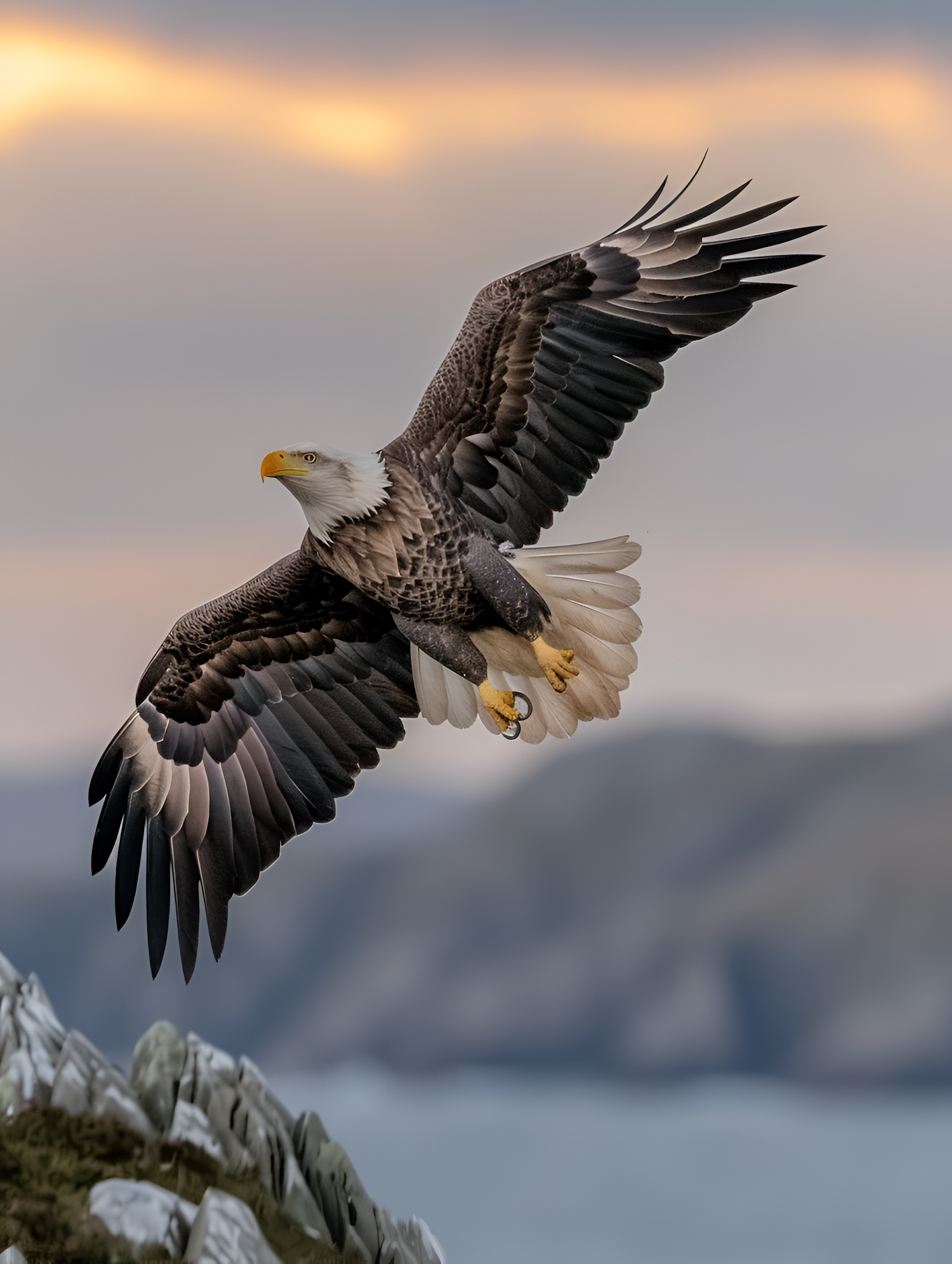 Majestic bald eagle soaring with wings spread wide against a serene mountain backdrop at sunrise or sunset.