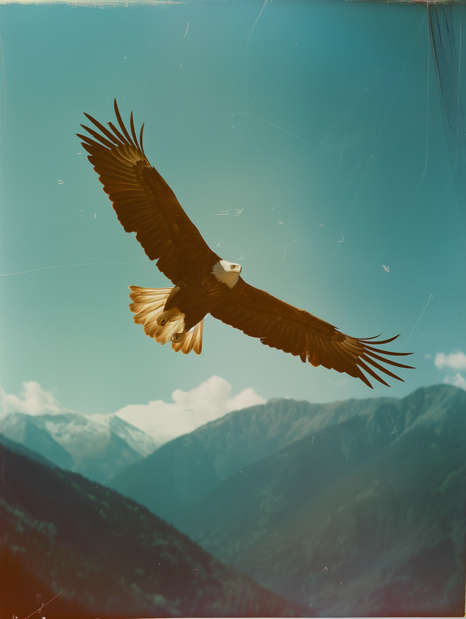 Majestic bald eagle soaring over snow-capped mountains under a clear blue sky, embodying freedom and natural beauty.